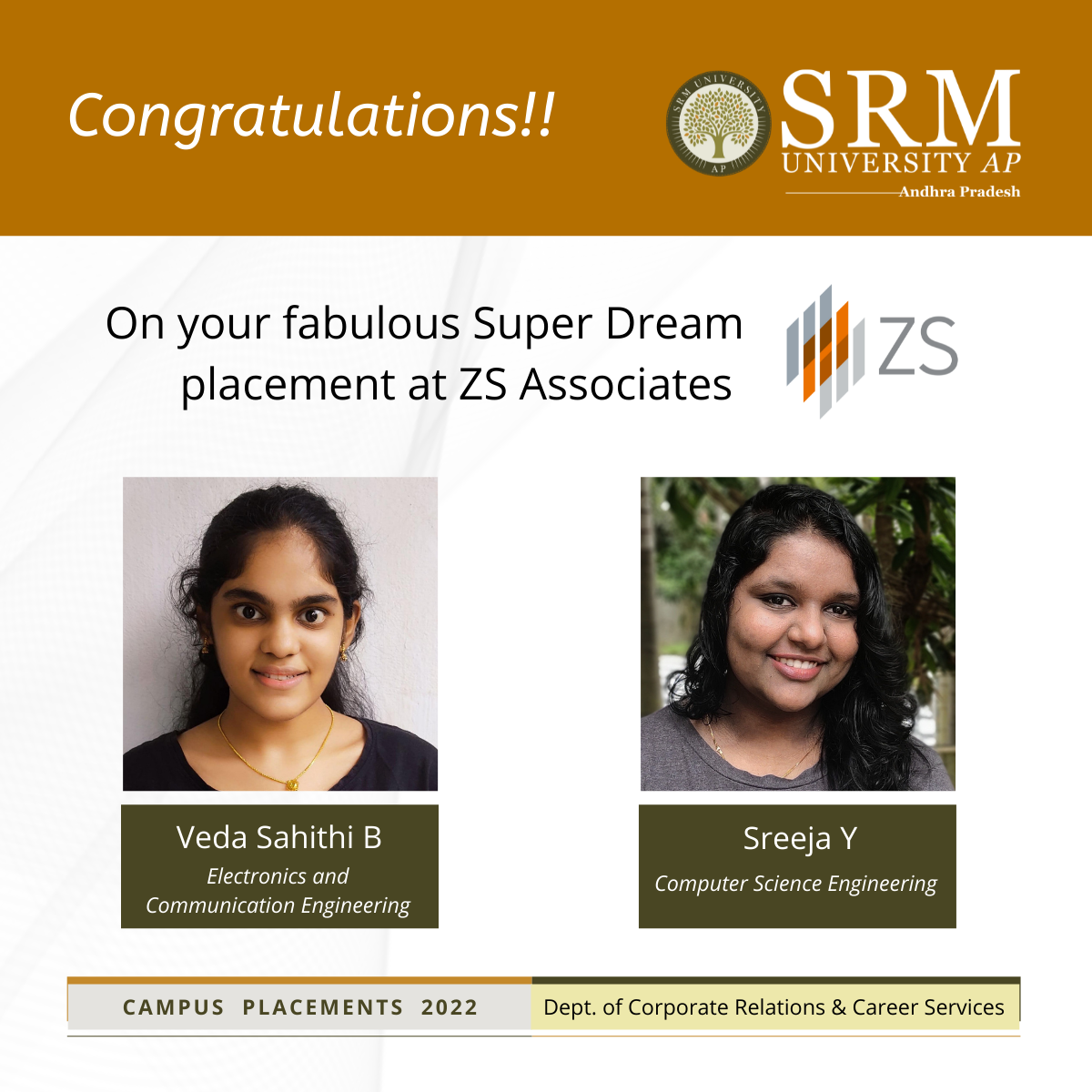 Bandi Veda Sahithi from the Department of Electronics and Communication Engineering, and Sreeja Y from the Department of Computer Science Engineering have been placed at ZS Associates with an exciting CTC of 14.35 LPA.