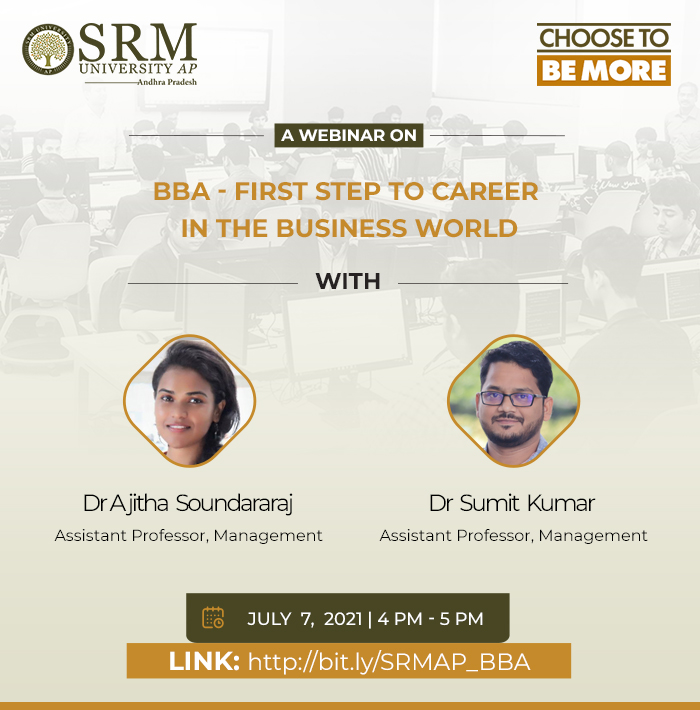 The Bachelor of Business Administration (BBA) is a three-year professional undergraduate course that can be pursued by students from all three streams-Science, Commerce and Arts. On July 7, 2021, the Department of Management at SRM University-AP is hosting a webinar at 4.00 pm to introduce its BBA course curriculum, scope, and career opportunities to the aspirants. Dr Ajitha Soundararaj and Dr Sumit Kumar, Assistant Professors at the Department of Management, will deliver lectures on the topic “BBA-First Step to a Career in the Business World.”