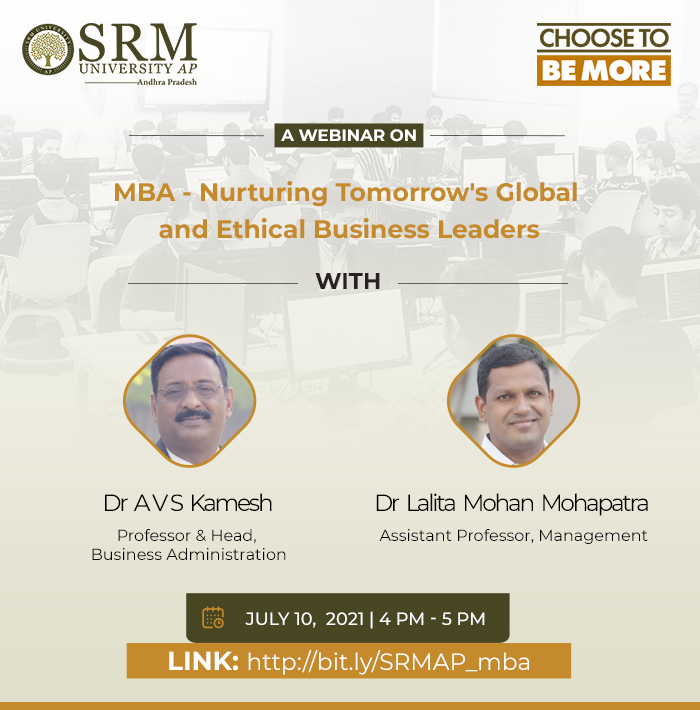 School of Entrepreneurship and Management Studies (SEAMS) of SRM University, Andhra Pradesh is committed to producing socially conscious managers, leaders and entrepreneurs. Dr AVS Kamesh and Dr Lalitha Mohan Mohapatra from the Department of Management will address the MBA aspirants on the topic “MBA-Nurturing Tomorrow’s Global and Ethical Business Leaders” on July 10, 2021, at 4.00 pm. This virtual session will introduce the thrust areas of the subject, syllabus, and future career opportunities of MBA at our university.