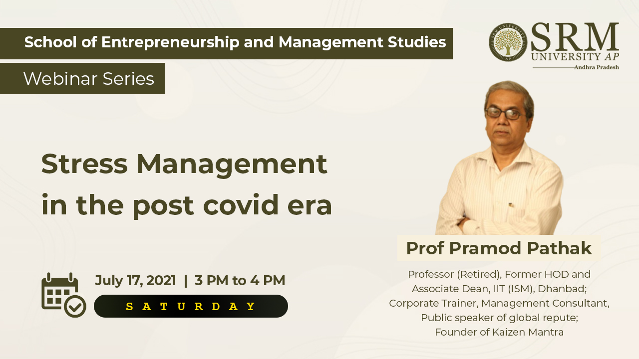 School of Entrepreneurship and Management Studies (SEAMS), SRM University-AP is arranging another mind awakening session of the Webinar series on “Stress Management in the Post Covid Era” on July 17, 2021, at 3.00 pm. Former HOD and Associate Dean, IIT (ISM), Dhanbad, Prof Pramod Pathak will be the main speaker and trainer of the event. The aim of the webinar is to impart effective stress management strategies for post-Covid-19 life.