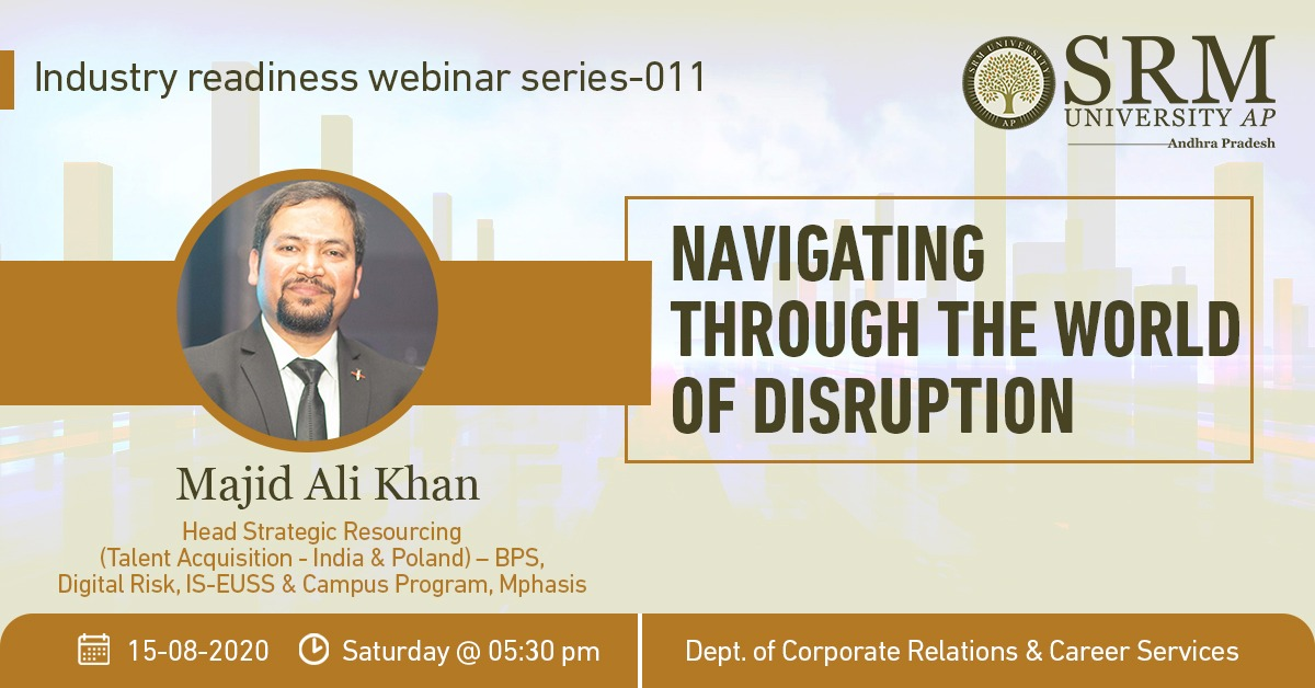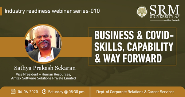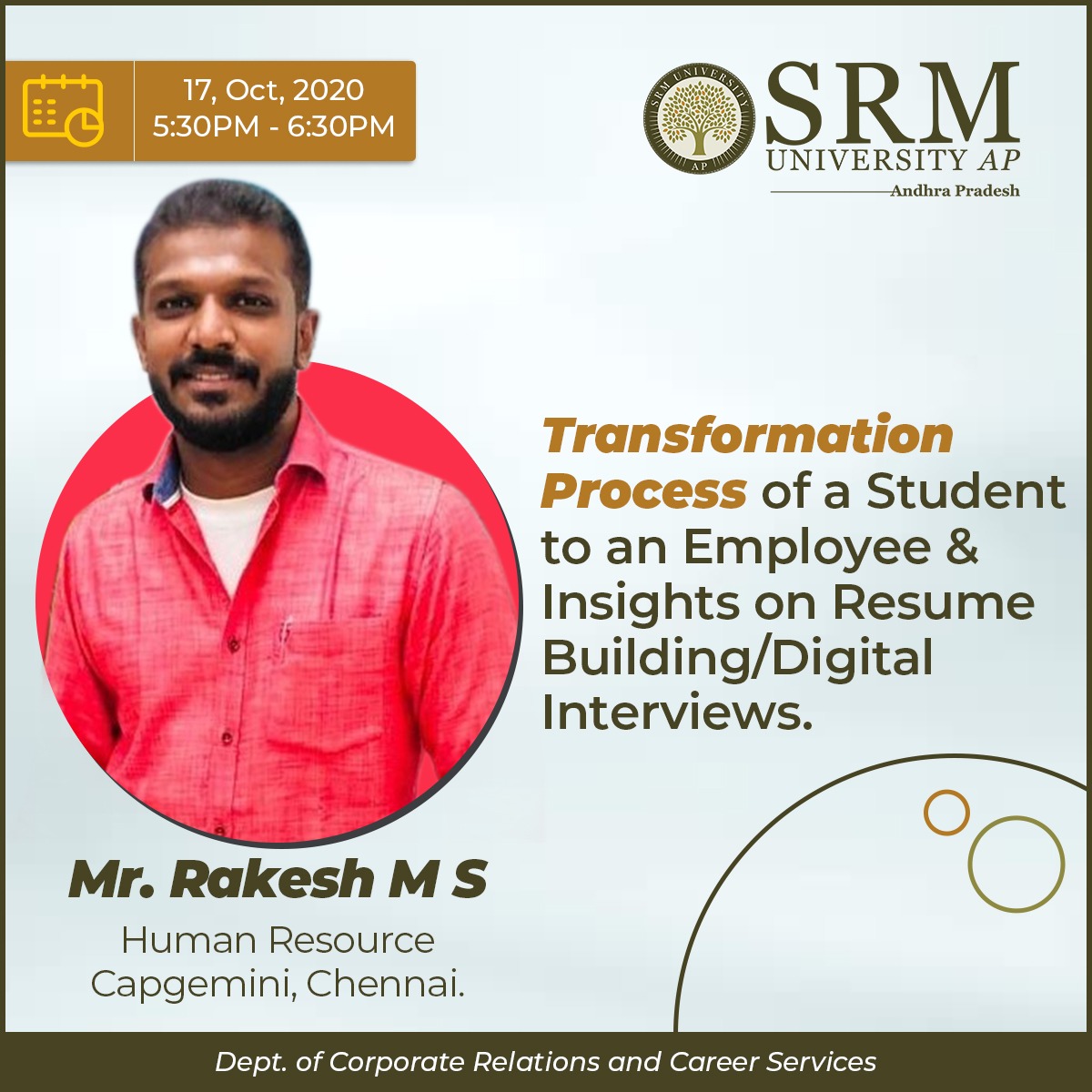 Department of Corporate Relations & Career Services, SRM university-AP, Andhra Pradesh is presenting a webinar on “Transformation Process of a student to an employee & insights on resume building/digital interviews”. On October 17, 2020, at 5.30 p.m., Mr Rakesh M S, Human Resource, Capgemini, Chennai, will be addressing the students of SRM AP. He holds more than 9 years of experience in Human Resource Management, where he handles and leads HR functions such as HR Operations & Business HR Partner role, along with leading the Fresher’s Batch Management. He has been invited as Guest Lecturer in several Engineering Colleges to provide insights on the transition state of students to employees. His sessions encompass the current scenario, the gaps, the ways to bridge the gaps, the challenges, and do’s & don’ts crucial to the students. Students are recommended to attend the session with Mr Rakesh M S, who will draw practical, in-depth, ground-level examples to decipher the stages of transition. He will also be sharing significant information on resume building and digital interviews, which will help the students to excel in the recruitment drive and grab their dream job offer.