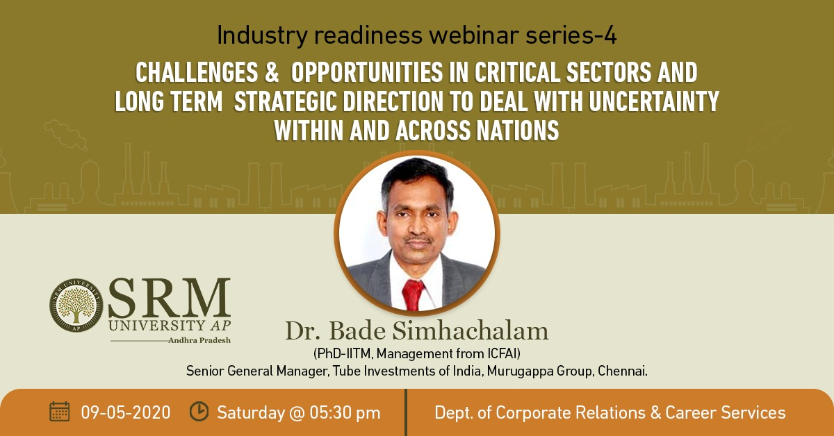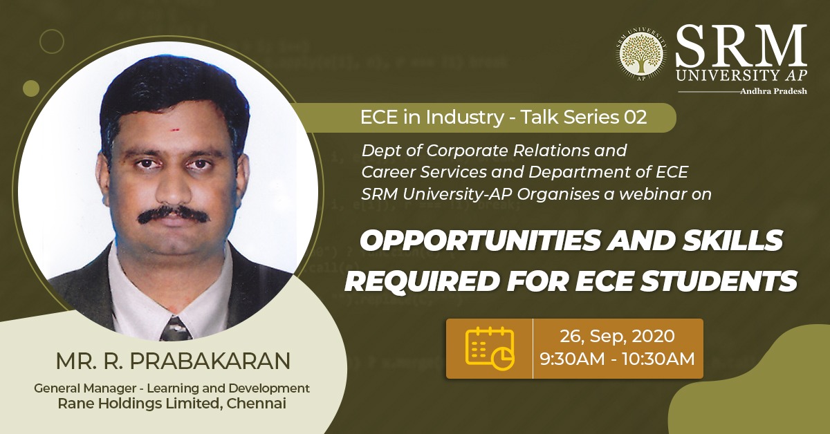 In collaboration with the Department of Corporate Relations & Career Services, the Department of Electronics and Communication Engineering, SRM University-AP, Andhra Pradesh introduces “ECE in industry” programme, which will comprise of a series of talks by eminent industry experts. The next instalment of the series brings Mr R. Prabakaran, General Manager- Learning and Development, Rane Holdings Limited, Chennai on September 26th, 2020, at 9.30 a.m. Mr Prabakaran will be delivering a talk on “Opportunities and Skills Required for ECE Students”.