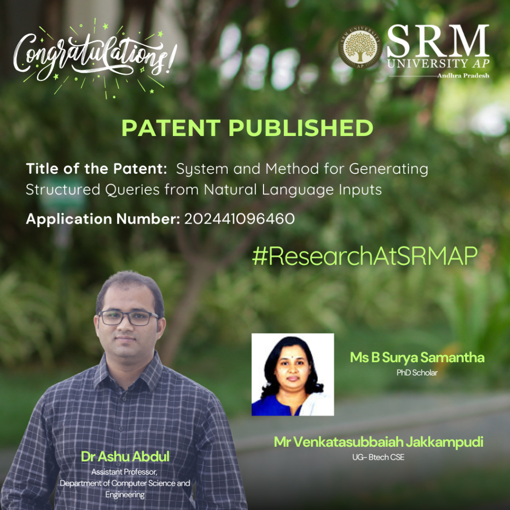 This research paper, by Dr Ashu Abdul, Assistant Professor and research scholar Ms Surya Samantha Beri along with fourth-year student, Mr Jakkampudi Venkatasubbaiah from the Department of Computer Science and Engineering explore a framework designed to help users retrieve and analyse data without requiring any Structured Query Language (SQL) knowledge. The paper titled, “System and Method for Generating Structured Queries from Natural Language Inputs“, is particularly relevant as it enables individuals, like a car dealer seeking sales insights, to interact with their databases using everyday language. Such accessibility underscores the importance of this research in democratising data access for all users.