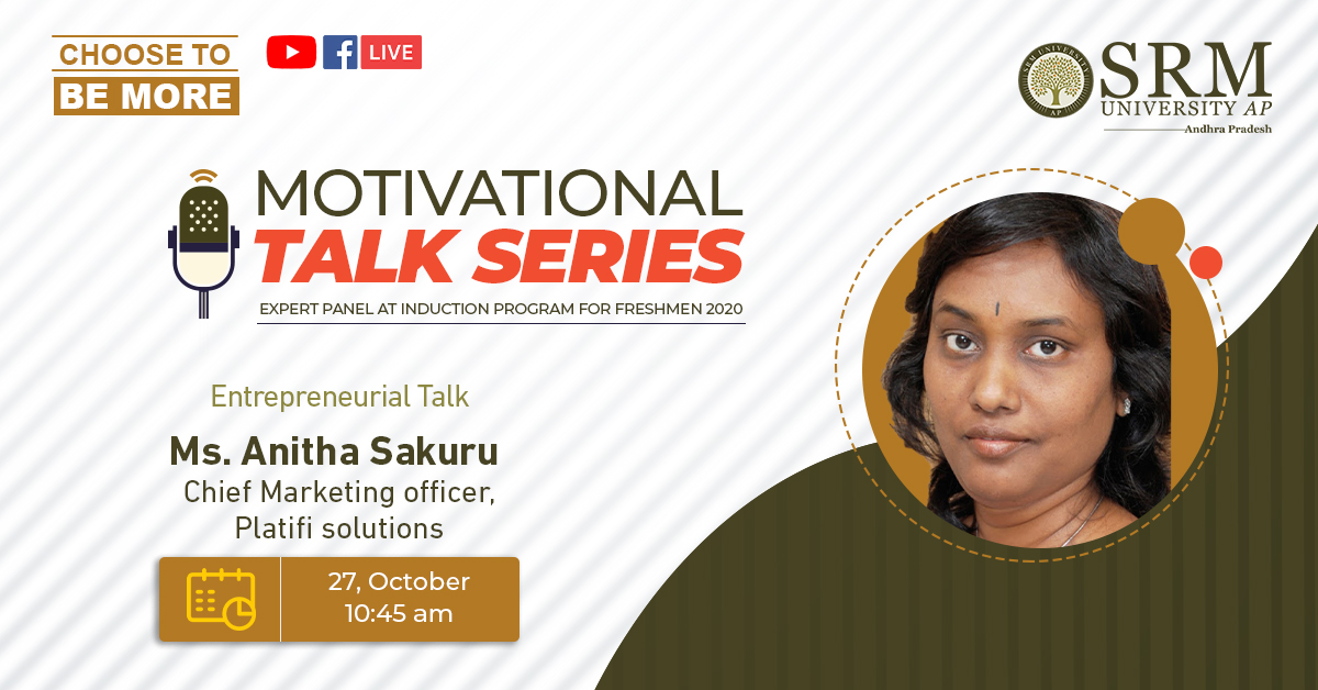 After the success of the entrepreneurial talk by Ms Anita Sakuru in the first edition of the Orientation Programme 2020, Ms Anita Sakuru has been earnestly requested by SRM University-AP, Andhra Pradesh to inspire and enlighten the audience in the 2nd Orientation Programme 2020. Ms Anita Sakuru will be conducting the session with the Freshmen 2020 on October 27, 2020, at 10.45 a.m. Ms Sakuru is prominently known for her flair for entrepreneurship and innovation. She is the co-founder of Pragma Inc, an IT consulting firm founded in 1995. She served as an Executive Vice President for Kenexa and was instrumental in the IT transformation of the company. She has produced and judged a startup show on TV5 named Startup Junction. In addition, Ms Sakuru, is currently a chapter head for 50k ventures, a network that funds startups.