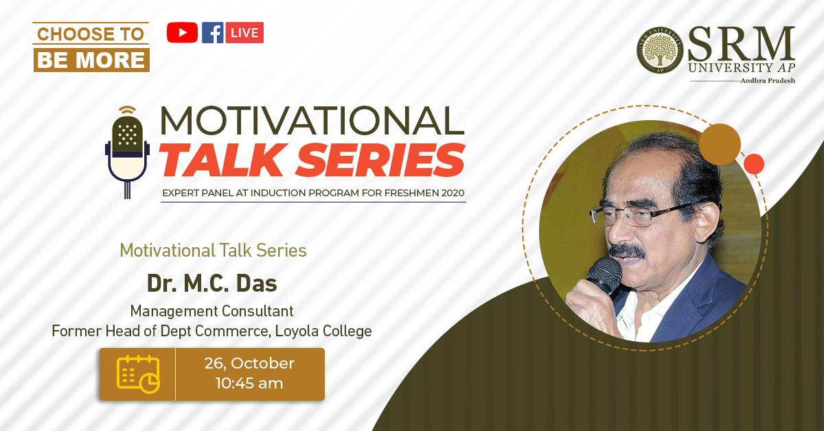 The inspirational talk series during the second edition of the Orientation Programme designed for Freshmen 2020 by SRM University- AP, Andhra Pradesh will commence with a session by Dr Manda Chiranjeevi Das on October 26, 2020, at 10.45 a.m. Dr M C Das is a coveted Management Consultant who owns a certificate in Lean Six Sigma Green Belt in addition to certificates in Counselling, Communication Media, Transactional Analysis, Radio & Journalism, and Effective Classroom Communication. He is a Visiting Professor at Acharya Nagarjuna University, Krishna University, K L University, and Vivekananda Institute of Human Excellence along with being a Professor Emeritus and Dean of Management Studies at SRK Engineering College.