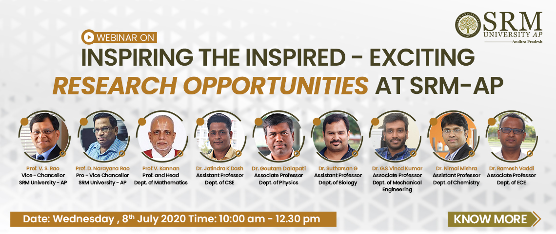 SRM University-AP, Andhra Pradesh organizes webinar on 8th July 2020 at 10 a.m. titled “Inspire the Inspired: Excellent Research Opportunity in SRM University – AP” to engage the DST-INSPIRE students. Prof. Vajja Sambasiva Rao, Vice-Chancellor, SRM University-AP, will be preceding the webinar with the welcome remarks, and Prof. D Narayana Rao, Pro Vice-Chancellor, SRM University-AP, will be delivering a presentation that would introduce the phenomenal research activities and facilities of the university to the audience. Prof. V. Kannan, Professor, Department of Mathematics, Dr. Jatindra Kumar Dash, Assistant Professor, Department of Computer Science and Engineering, Dr. Goutam Dalapati, Associate Professor, Department of Physics, Dr. Sutharsan Govindarajan, Assistant Professor, Department of Biological Sciences, Dr. G.S. Vinod Kumar, Associate Professor, Department of Mechanical Engineering, Dr. Nimai Mishra, Assistant Professor, Department of Chemistry, and Dr. Vaddi Ramesh, Associate Professor, Department of Electronics and Communication Engineering will be representing their respective department in the webinar to showcase the research being conducted by the expert faculty.