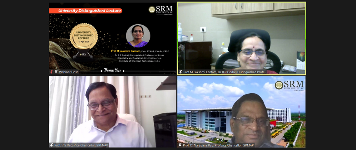 Observing the ninth edition of University Distinguished Lecture Series, SRM University, Andhra Pradesh, invited Prof Lakshmi Kantam Mannepalli, the Dr B P Godrej Distinguished Professor of Green Chemistry, Department of Chemical Engineering, Institute of Chemical Technology, Mumbai, to address a captivating speech on “Design and Development of Homogeneous/Heterogeneous Catalysts for Sustainable Chemical Industry”. Prof D Narayana Rao, Pro Vice-chancellor, inaugurated the talk with a welcome speech. The ceremony was attended by Prof VS Rao, Vice-Chancellor SRMAP and Dr S Mannathan, Department of Chemistry. Prof D Narayana Rao expressed that “Industrial collaboration is very much necessary in the context of self-reliant India (Atma Nirbhar Bharat)”.