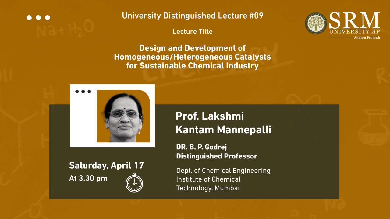 SRM University-AP, Andhra Pradesh, invites Prof M Lakshmi Kantam in the ninth edition of the University Distinguished Lecture Series to deliver the keynote address on “Design and Development of Homogeneous/Heterogeneous Catalysts for Sustainable Chemical Industry” on Saturday, April 17, 2021, at 03.30 PM. Our guest of the evening, Prof M Lakshmi Kantam, FNA, FTWAS, FNASc, FRSC, is a renowned name in the field of Chemical Sciences and Engineering. She is presently the Dr B P Godrej Distinguished Professor of Green Chemistry and Sustainability Engineering at the Department of Chemical Engineering, Institute of Chemical Technology, Mumbai.
