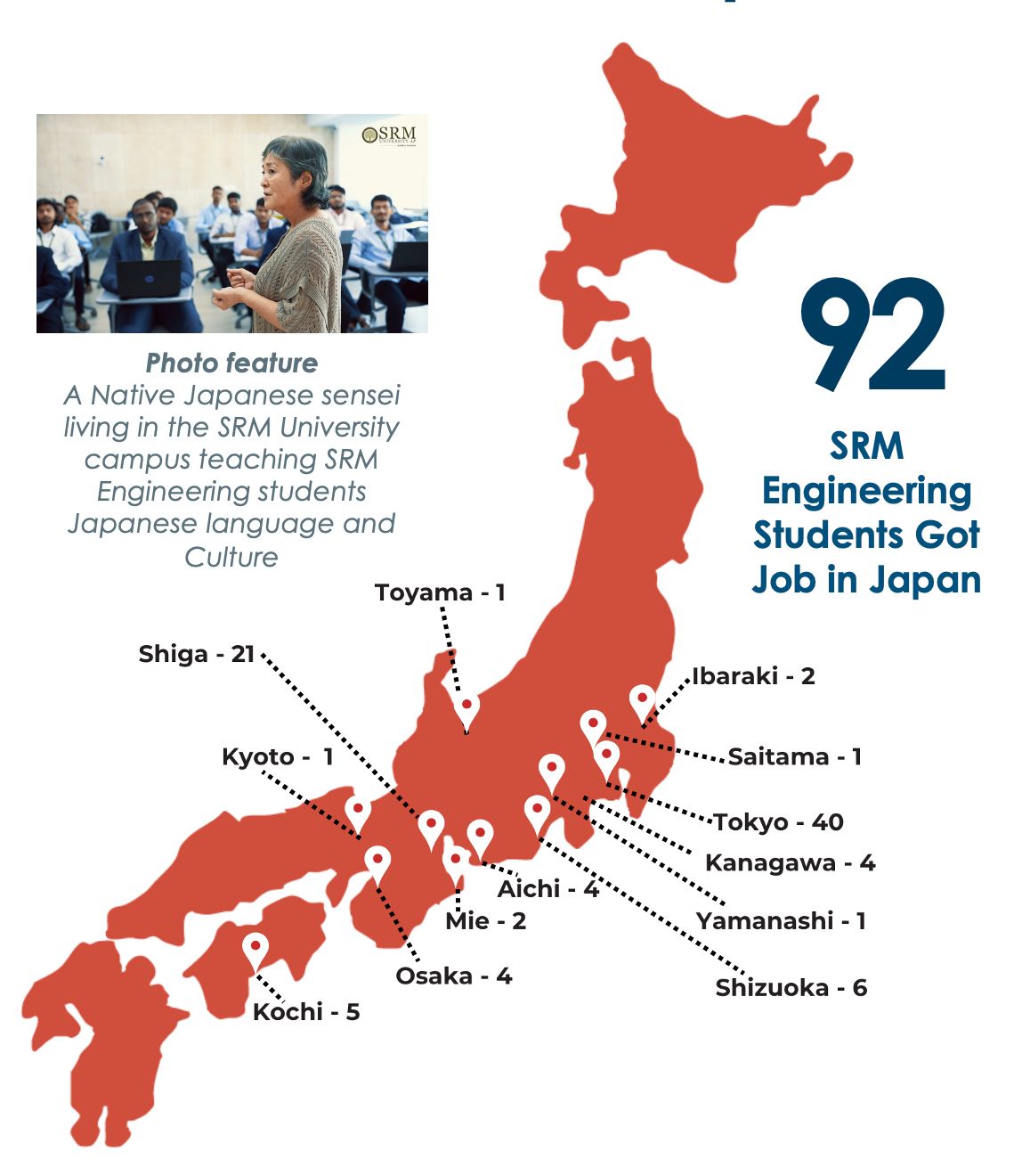 - Through our dedicated "Industry Readiness Center”, we ensure that our SRM University engineering students are equipped with the necessary skills and knowledge to excel in the Japanese job market, producing highly skilled engineers primed for success