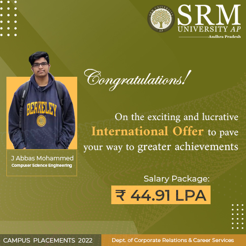 SRM University-AP happened to be the perfect place that shaped him up to pursue the career of his dreams. Our collaboration with leading enterprises in the world turned out to be an excellent avenue for many to walk ahead to a horizon of opportunities. The Department of Corporate Relations & Careers Services is also doing an amazing job in training the students and encouraging them to apply for the best available prospects. Let us listen to Abbas as he pours out his excitement.