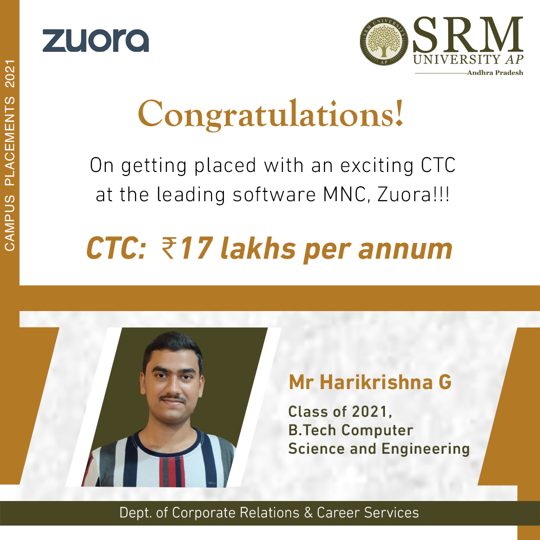 The maiden graduates of SRM University-AP have secured 100 per cent placements in the campus recruitment drive where 500+ reputed companies from India and abroad visited our university. More than 70 per cent of the students successfully bagged the dream and super dream offers. Ganji Harikrishna, a CSE graduate, received a dream offer with a salary package of 17 lakhs per annum from ZUORA, a leading software MNC. He joined as a full-time Senior Development Engineer (SDE) and would work in their Chennai office.