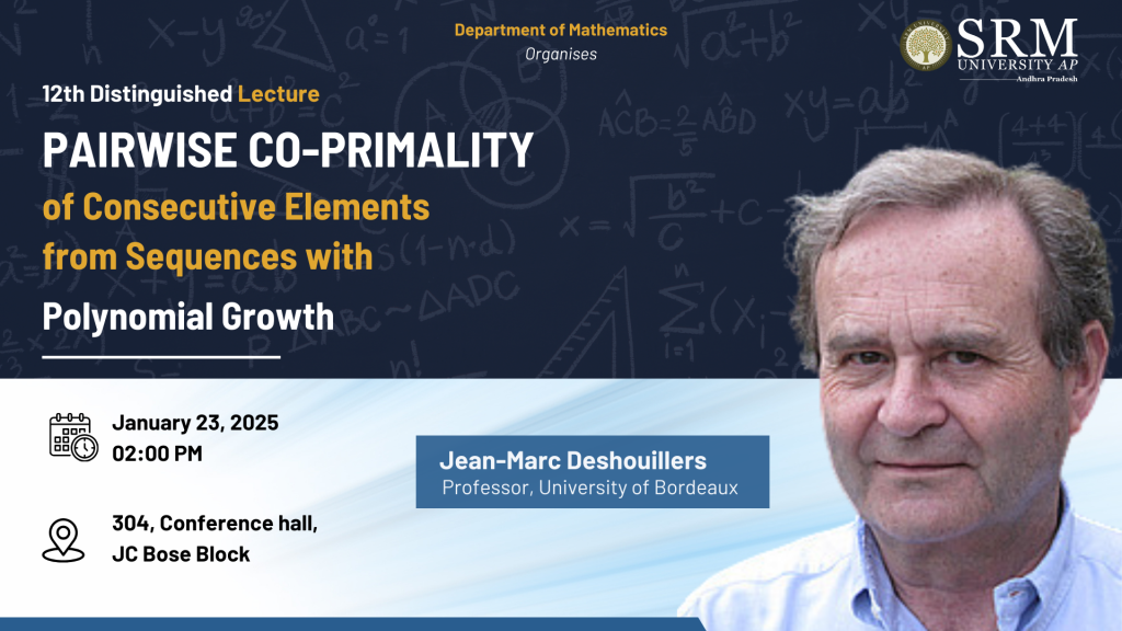The Department of Mathematics organises the 12th session of the Distinguished Lecture Series on January 23, 2025. Renowned French mathematician, Prof. Jean-Marc Deshouillers will deliver the keynote session on the topic “Pairwise co-primality of consecutive elements from sequences with polynomial growth.”