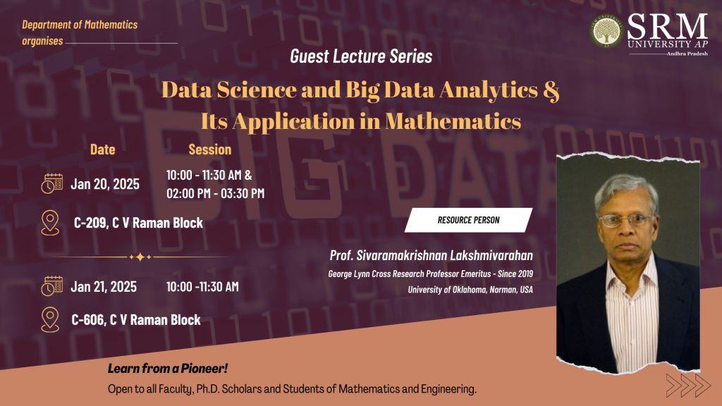 The Department of Mathematics is organising a Guest Lecture Series focused on Data Science and Big Data Analytics. The lecture series scheduled to be held from January 20-21, 2025 will be led by Dr Sriramakrishna Lakshmivarahan from the University of Oklahoma. The lecture series aims to deepen students’ understanding of the subject. Participants will also have the opportunity to explore the latest trends, innovations, and advancements in the field, while fostering interdisciplinary collaboration.
