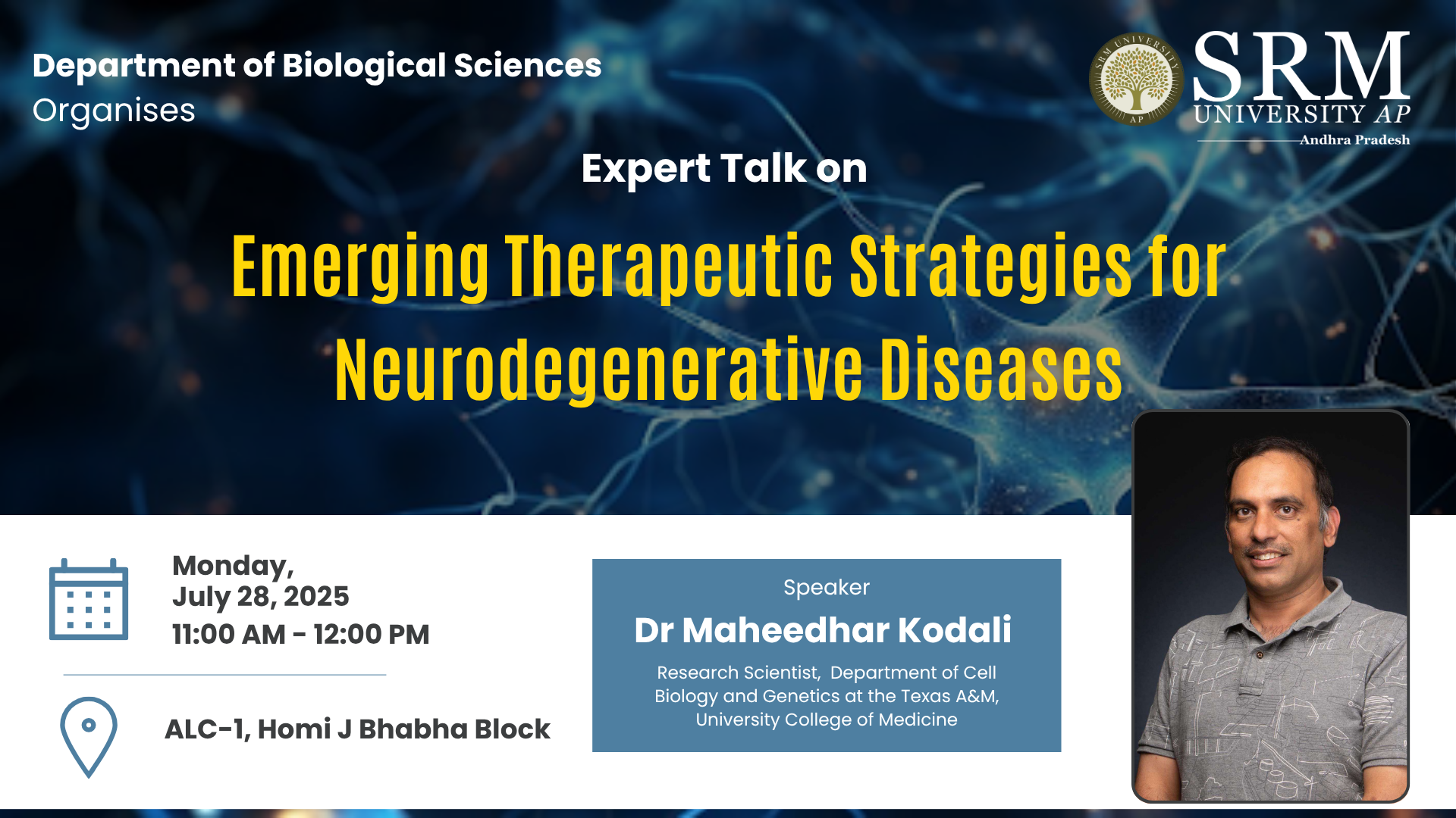 The Department of Biological Sciences is organising an Expert Talk on Emerging Therapeutic Strategies for Neurodegenerative Diseases. The resource person, Dr Maheedhar Kodali, will lead the session and offer students insights on the latest advances in treatment approaches and research findings.