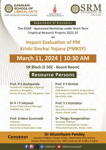 The Department of Economics is thrilled to announce a highly anticipated workshop aimed at discussing and enhancing the understanding of projects submitted to the Indian Council of Social Sciences Research (ICSSR) on the Pradhan Mantri Krishi Sinchayee Yojana (PMKSY). This enlightening event will take place on March 11, 2024, and promises to be a confluence of minds dedicated to maximising the effectiveness of PMKSY projects.