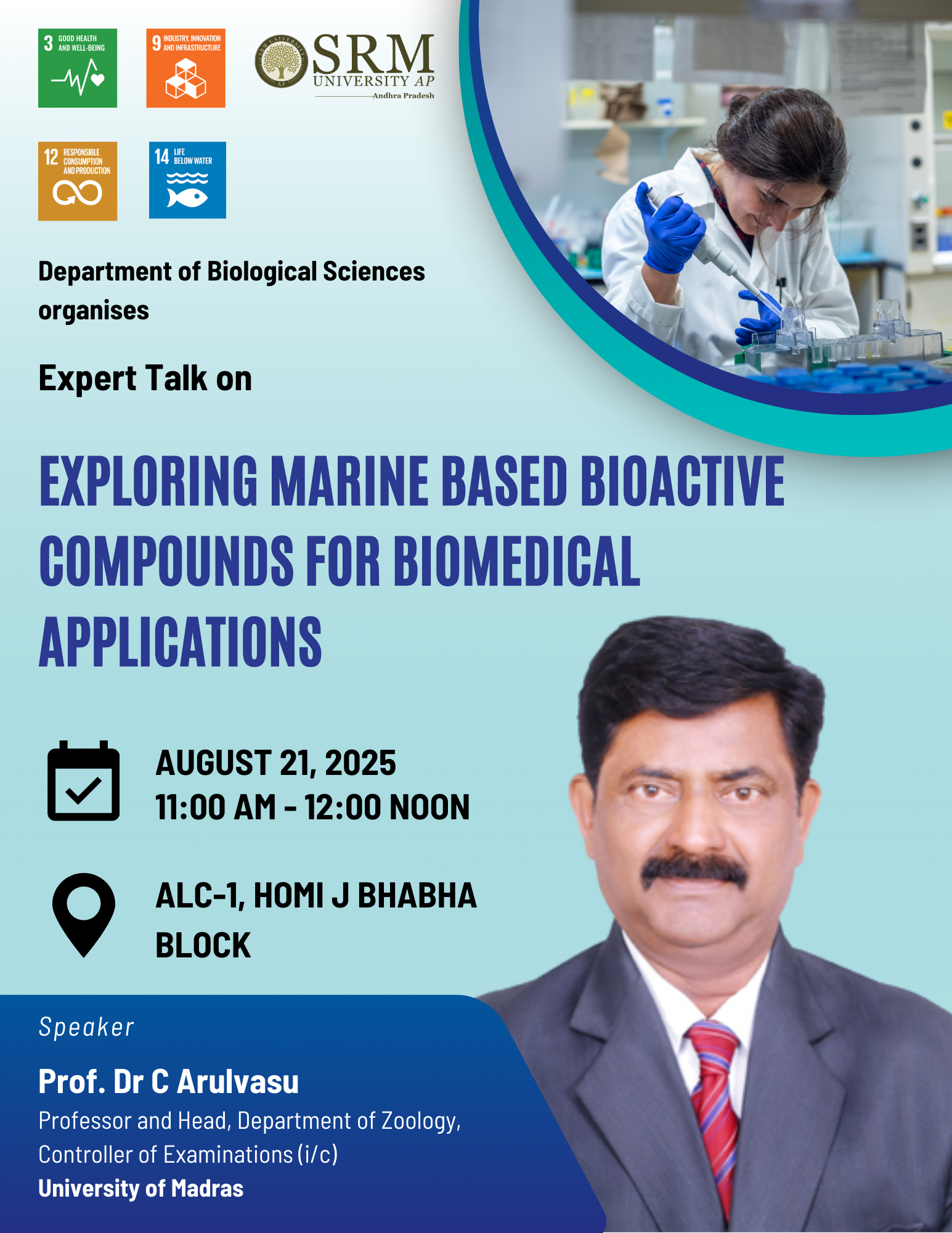 The Department of Biological Sciences is organising an expert talk by Prof. Dr. C. Arulvasu, Head of the Department of Zoology and Controller of Examinations (i/c), University of Madras on August 21, 2025.