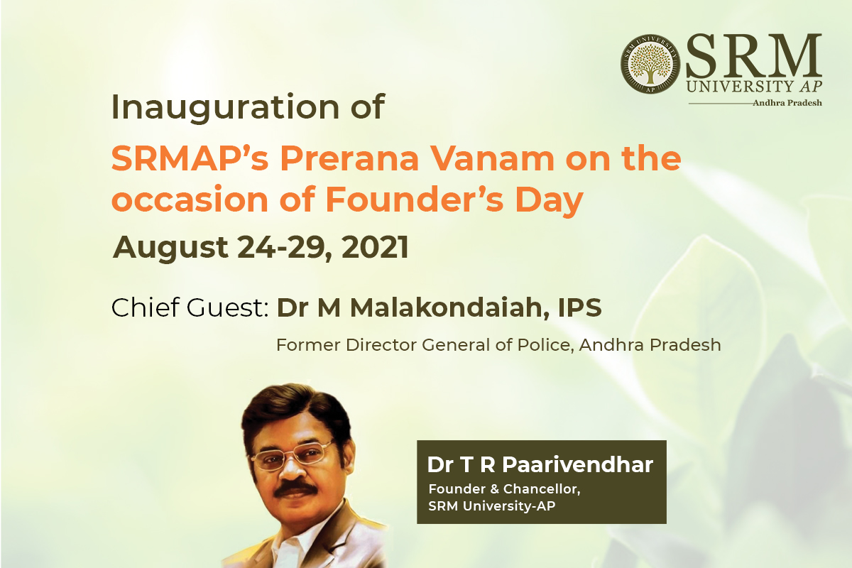 SRM University-AP celebrates the birthday of Founder Chancellor Dr T R Paarivendhar as Founder’s Day on August 24, 2021, at 10.00 am. The inauguration of Prerana Vanam, a week-long (Aug 24-29) event of planting trees across the university will be held as part of the celebrations. Dr M Malakondaiah IPS, former Director-General of Police, Andhra Pradesh, will be the chief guest of the day. Vice-Chancellor Prof Vajja Sambasiva Rao; Pro Vice-Chancellor, Prof D Narayana Rao; Dr Vinayak Kalluri, Registrar; and Wg Cmdr Venkataachalam Sekkappan, Director-CLM will address the gathering.