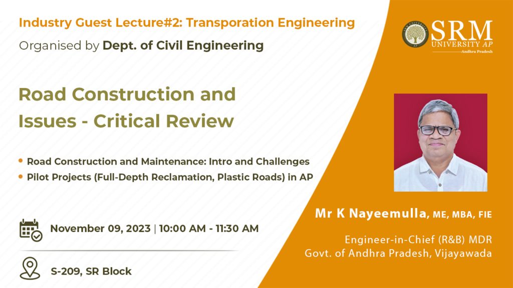 The Department of Civil Engineering at SRM University-AP is thrilled to announce that Mr K Nayeemulla, the Engineer-in-Chief (R&B) MDR Govt. of Andhra Pradesh, Vijayawada, will be the esteemed guest speaker for the upcoming 2nd Industry Guest Lecture on “Road Construction and Issues – Critical Review” scheduled to be held on November 09, 2023. The lecture promises to be insightful and informative, covering a wide range of topics related to road construction and maintenance. Mr Nayeemulla will also discuss pilot projects on FDP and waste plastic roads in Andhra Pradesh, providing valuable insights and perspectives on these innovative initiatives.