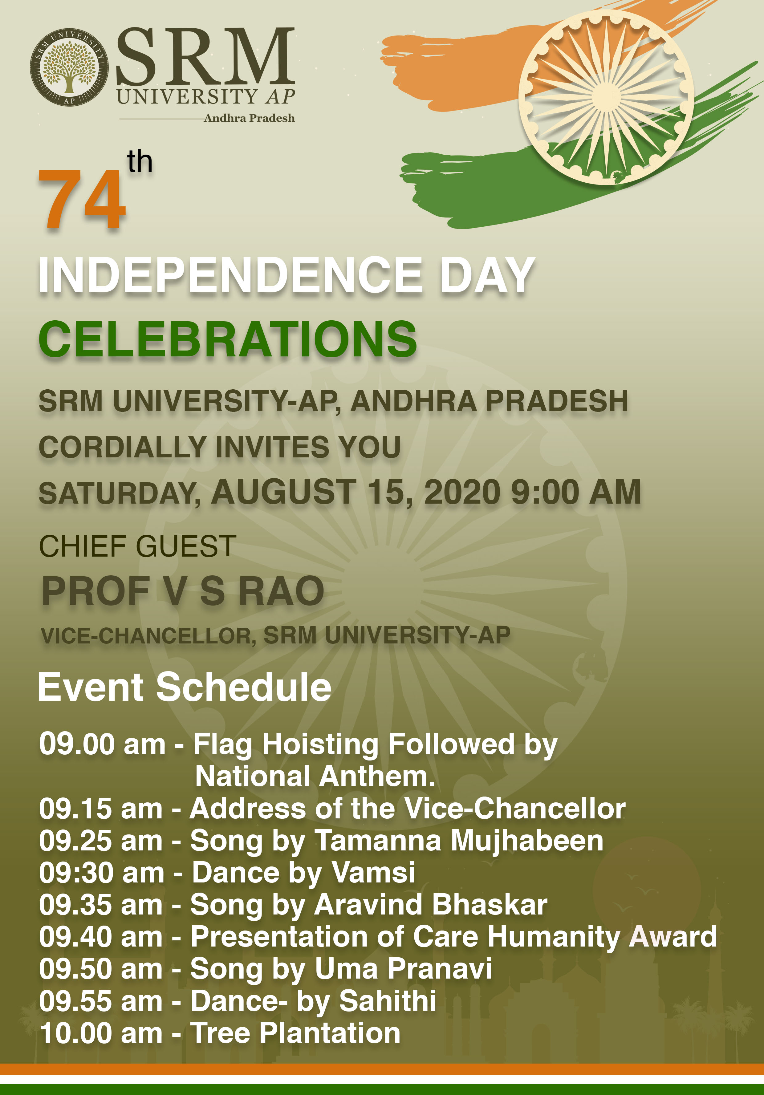 SRM University-AP, Andhra Pradesh is celebrating Independence Day 2020 endowed to our nation by our freedom fighters. Prof V. S. Rao, Vice-Chancellor, will initiate the celebration by hoisting the national flag at 9 a.m., followed by an address. He will also present “Care Humanity” award to D. Lenin babu and Yarramsetti Saisrinu who nobly served the needy during the pandemic.