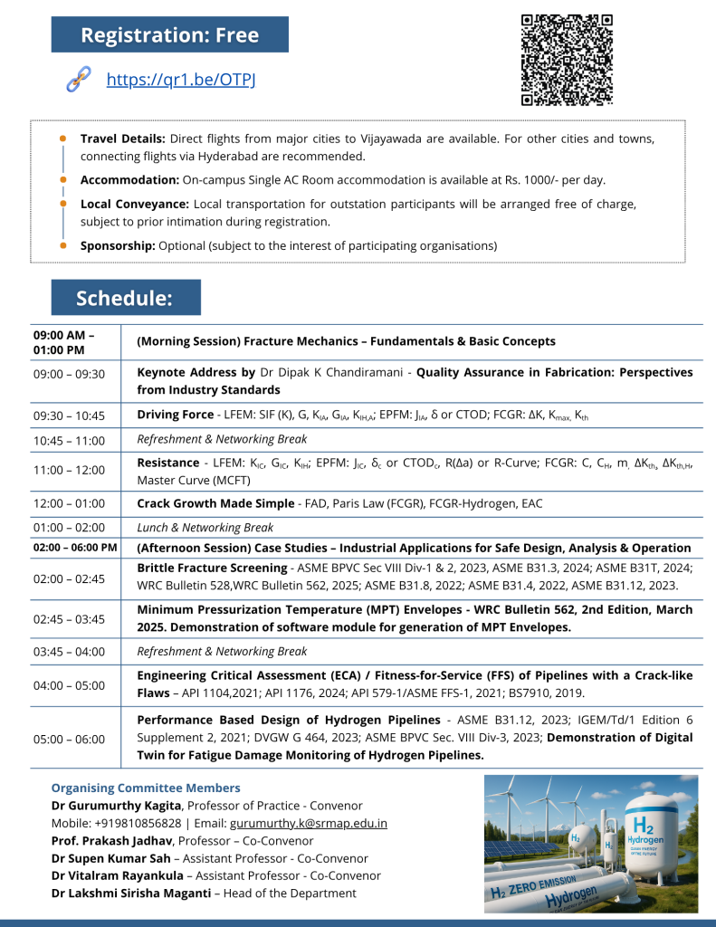 Tailored for industry professionals, this one-day industrial meet simplifies fracture mechanics into clear, practical concepts to support the safe design, analysis, and operation of pressure-containing systems – pressure vessels, piping, pipelines and green hydrogen storage and transportation equipment.