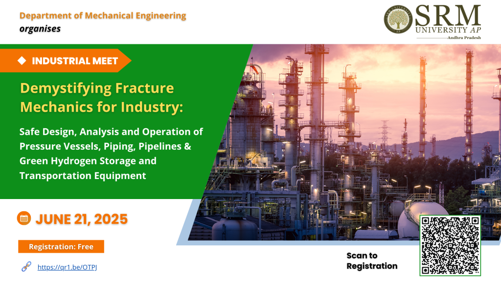 The Department of Mechanical Engineering is organising an Industrial Meet titled “Demystifying Fracture Mechanics for Industry: Safe Design, Analysis and Operation of Pressure Vessels, Piping & Pipelines & Green Hydrogen Storage and Transportation Equipment.” This workshop is tailored for professionals from the Refinery, Petrochemical, Oil & Gas, and Green Hydrogen sectors, providing a practical and application-focused understanding of fracture mechanics.