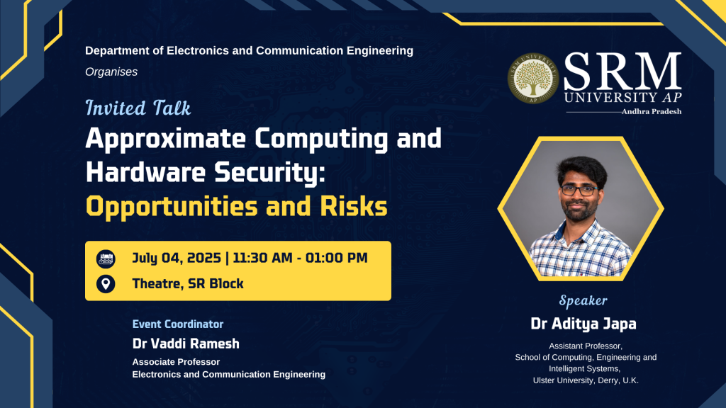 The Department of Electronics and Communication Engineering is organising an Invited Talk by Dr Aditya Japa, Assistant Professor, School of Computing, Engineering and Intelligent Systems, Ulster University, Derry, UK, on July 04, 2025. He will deliver an insightful session on the topic “Approximate Computing and Hardware Security: Opportunities and Risks”.