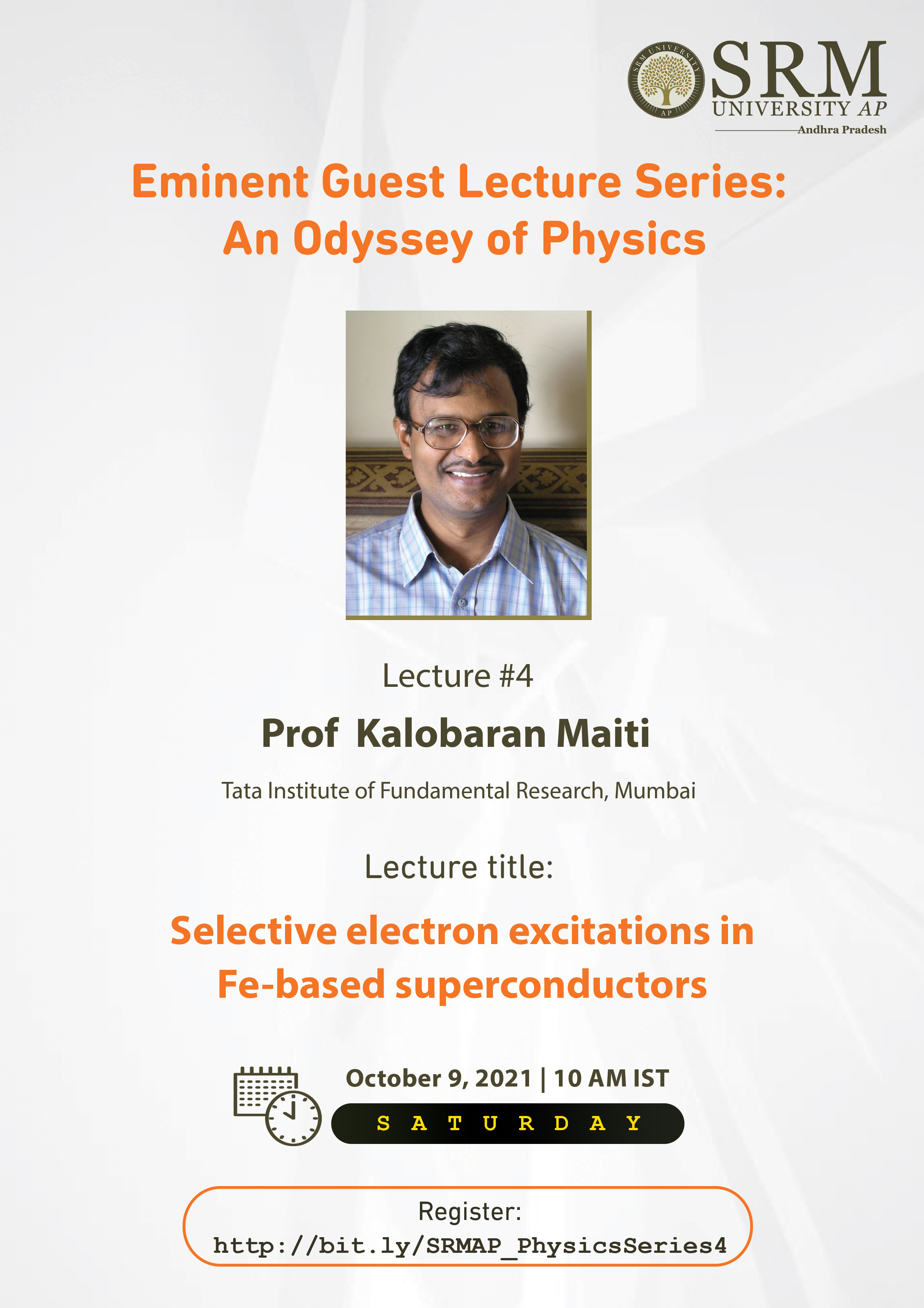 In the 4th chapter of the “Eminent Guest Lecture Series: An Odyssey of Physics”, the Department of Physics welcomes Dr Kalobaran Maiti to deliver the keynote address. Winner of the “Shanti Swarup Bhatnagar Prize for Science and Technology” in the category of Physical Sciences in 2010, Dr Kalobaran Maiti is an exemplary researcher. We are honoured to host him at SRM University-AP for his talk on “Selective Electron Excitations in Iron-based Superconductors,” on October 09 2021 at 10:00 am .