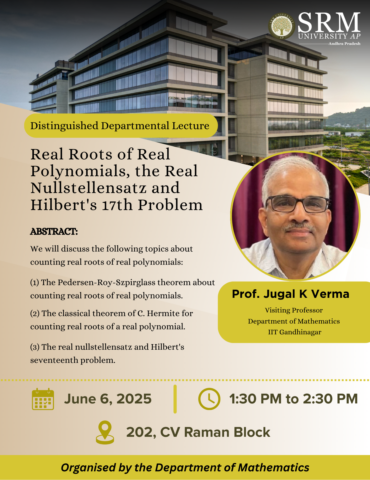 The Department of Mathematics is organising a Departmental Distinguished Lecture by Prof. Jugal K Vema. The lecture on Real roots of real polynomials, the real nullstellensatz and Hilbert’s 17th problem will discuss topics on counting real roots of real polynomials, including: