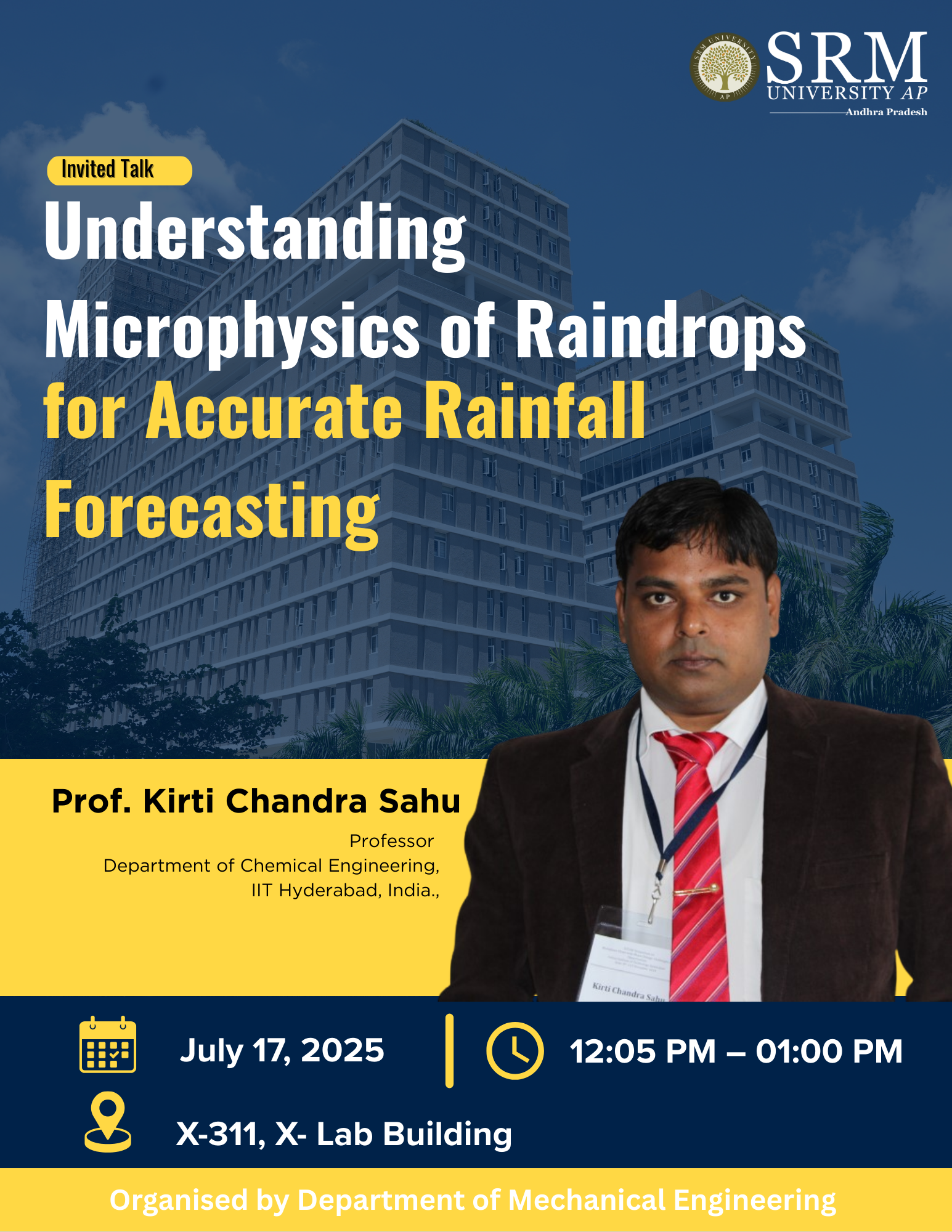 The Department of Mechanical Engineering at SRM University-AP is organising a Guest lecture titled “Understanding Microphysics of Raindrops for Accurate Rainfall Forecasting.” Prof. Kirti Chandra Sahu from the Department of Chemical Engineering- Indian Institute of Technology, Hyderabad, will deliver the session.