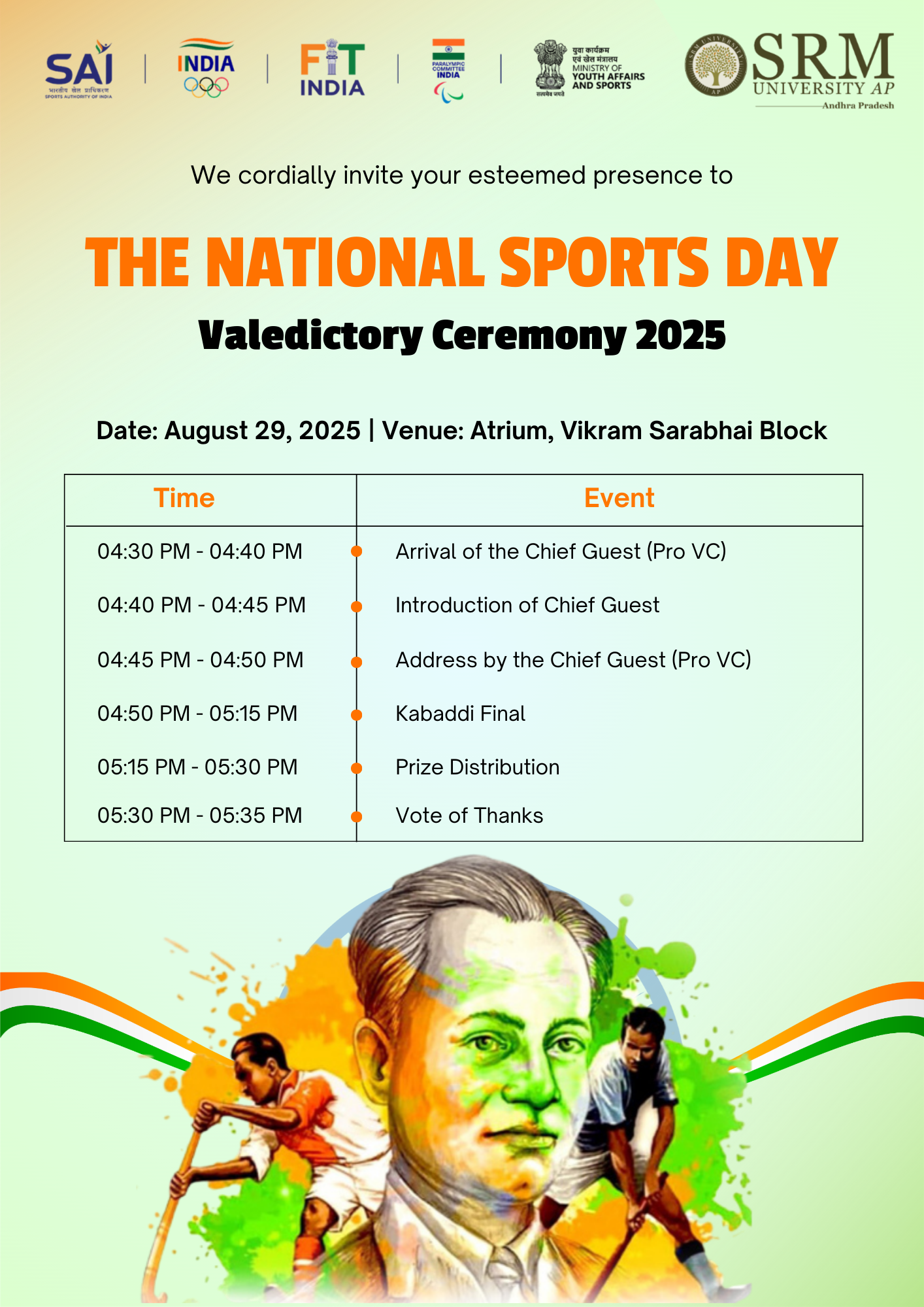 SRM University-AP observes National Sports Day in honour of hockey legend Major Dhyan Chand’s birth anniversary. The theme for this years’ Sports Day 2025 is “Har Gali Har Maidaan, Khelein Sara Hindustan.” This initiative, coordinated by the National Sports Authority of India in partnership with FIT India Mission and the Indian Olympic Association, supports India’s ambition to host the Olympic Games in 2036.