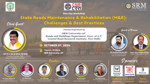SRM University-AP, in collaboration with the Andhra Pradesh Roads and Buildings (R&B) department and the Council of Scientific and Industrial Research-Central Road Research Institute (CSIR-CRRI), is set to host a one-day workshop titled “State Roads Maintenance and Rehabilitation (M&R): Challenges & Best Practices” on October 7, 2024. The event will take place at the university’s campus and will feature Sri B C Janardhan Reddy, the Hon’ble Minister for R&B, Government of Andhra Pradesh, as the chief guest.