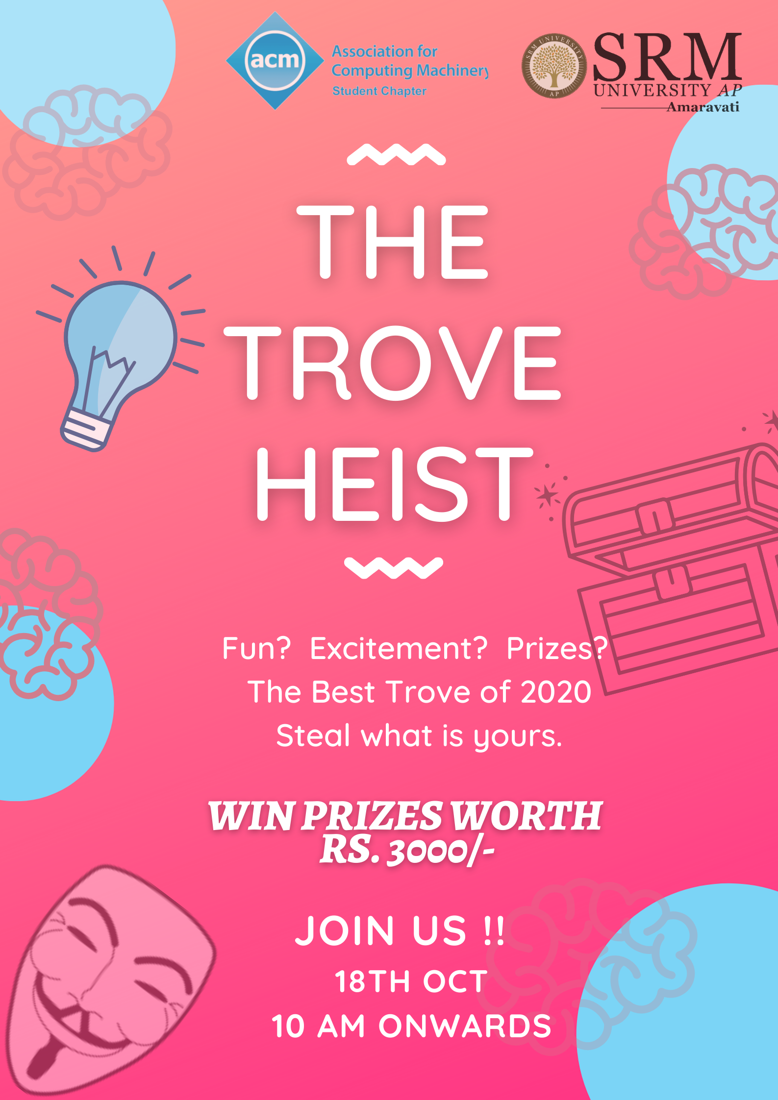 The Department of Student Affairs, SRM University-AP, Andhra Pradesh, along with SRM University AP ACM Student community, brings an excellent opportunity for the students to spend a light-hearted time, filled with fun and excitement. The department is giving away prizes worth Rs. 3000 to the winners of “The Trove Heist”,which is organized on October 18, 2020, at 10 a.m. In this online treasure hunt, the best deals can be stolen by paving the way through amazing mazes, hurdles, and puzzles. Students are urged to hone their grey cells and outshine their peers to win prizes galore.