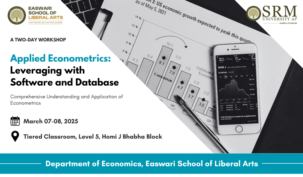 The Department of Economics, Easwari School of Liberal Arts is organising a Two-day Workshop on “Applied Econometrics: Leveraging with Software and Database” on March 07-08, 2025. This workshop aims to provide participants with a robust understanding of Econometrics, emphasising theoretical foundations and practical applications using STATA or R.