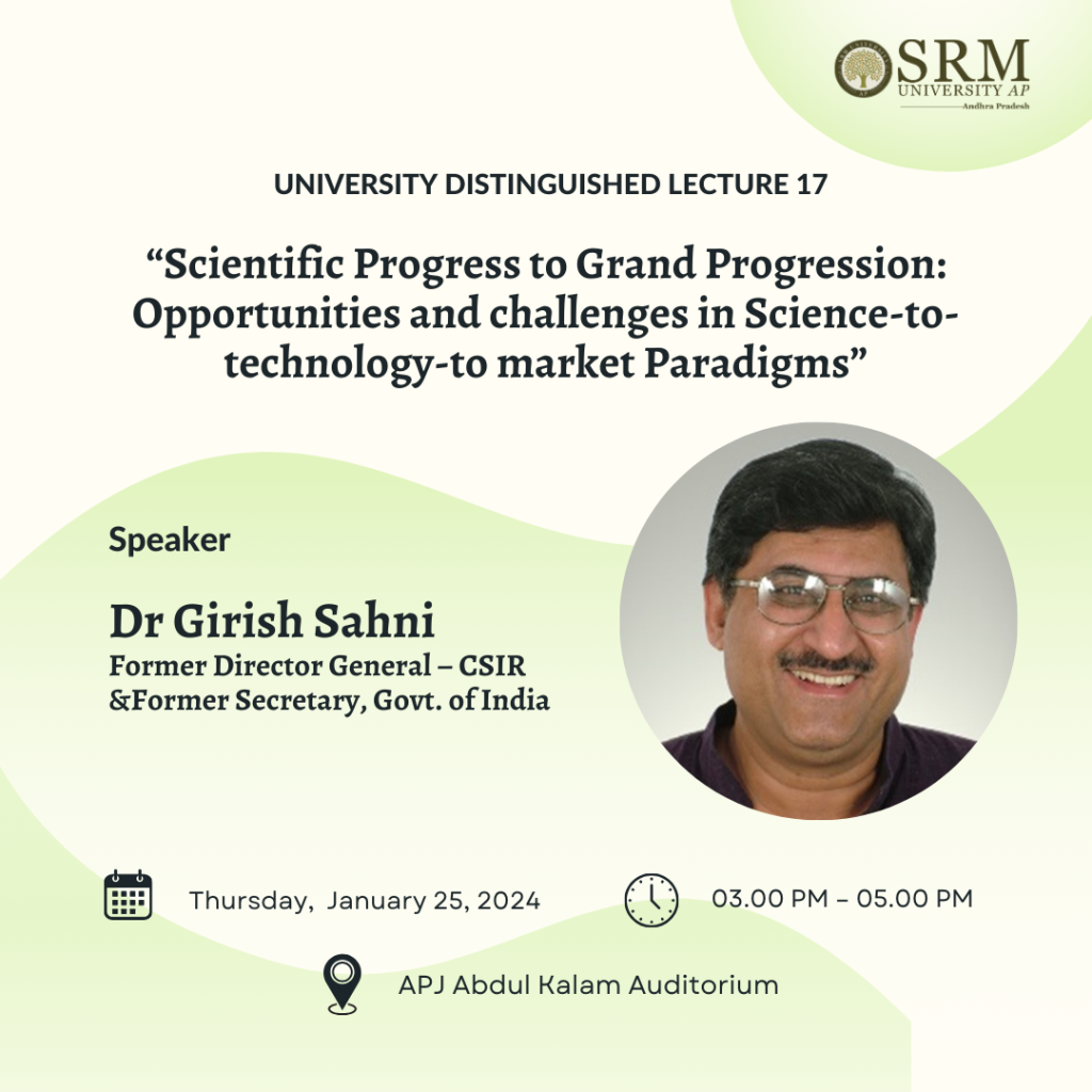 SRM University-AP is organising its 17th University Distinguished Lecture (UDL) on January 25, 2024. The university places great emphasis on research as a fundamental aspect of its academic pursuits and holds such events regularly. The varsity’s 17th UDL will host Dr Girish Sahni, former Director General of CSIR and Former Secretary – Government of India, as its guest speaker. Dr Sahni will address the audience on the topic “Scientific Progress to Grand Progression: Opportunities and Challenges in Science-to-technology-to-market Paradigms”.