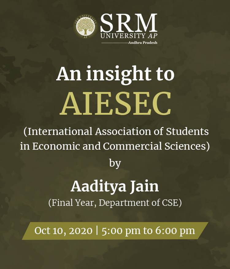 Department of Student Affairs organize “An insight to AIESEC” Department of Student Affairs, SRM University-AP, Andhra Pradesh has organized a webinar, where Aaditya Jain, Fourth Year, Department of Computer Science and Engineering, and Business Unit Head: AIESEC in Amaravati, will be hosting a session on “An insight to AIESEC”. As the world’s largest youth-run organization present in over 125 countries, International Association of Students in Economic and Commercial Sciences (AIESEC) provides cross-cultural global internships and volunteer exchange programmes to the youth. 6 students of SRM AP have successfully completed their internships through AIESEC in Greece, Egypt, Sri Lanka, and Vietnam to work on Website Development, IT, Business and Marketing, Explore, and Mechanical Projects. Students of SRM AP are encouraged to join the session on October 10, 2020, at 5 p.m. to know more about the internship programmes that would assist them to emerge as global professionals.