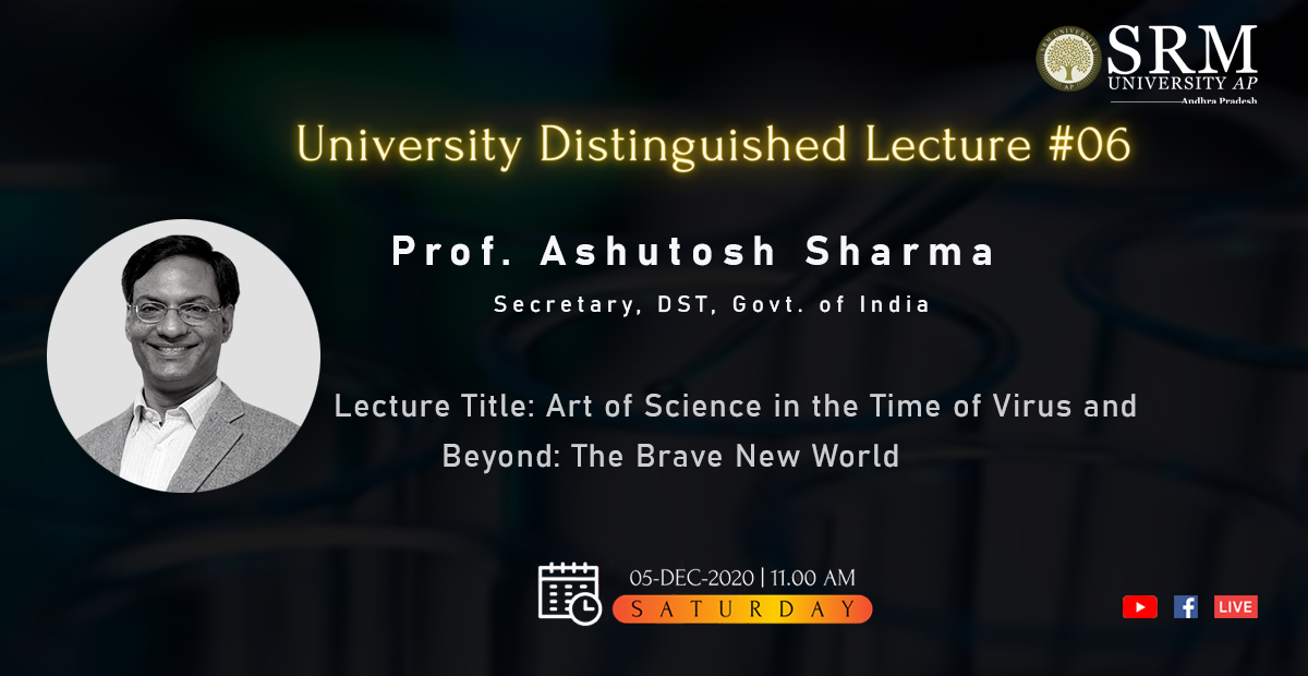SRM University-AP, Andhra Pradesh invites Prof Ashutosh Sharma, Secretary, Department of Science and Technology (DST), Government of India to address during the sixth chapter of the University Distinguished Lecture Series. Completing his B.Tech. from IIT Kanpur, and MS from Pennsylvania State University, Prof Sharma moved to the State University of New York to pursue his PhD. During his stint at IIT, Kanpur, Prof Sharma held important positions such as Professor, Institute Chair Professor, Head – Chemical Engineering, and Founding Coordinator – Nanosciences Center and Advanced Imaging Center. Prof Sharma’s engagement in interdisciplinary research spans across a wide spectrum involving nanotechnology, biomaterials, environment, and health. Being associated with DST since 2015, Prof Sharma has been instrumental in introducing several new programmes pertaining to infrastructure, human capacity building, innovation, advanced manufacturing, waste processing, clean energy, and many more.