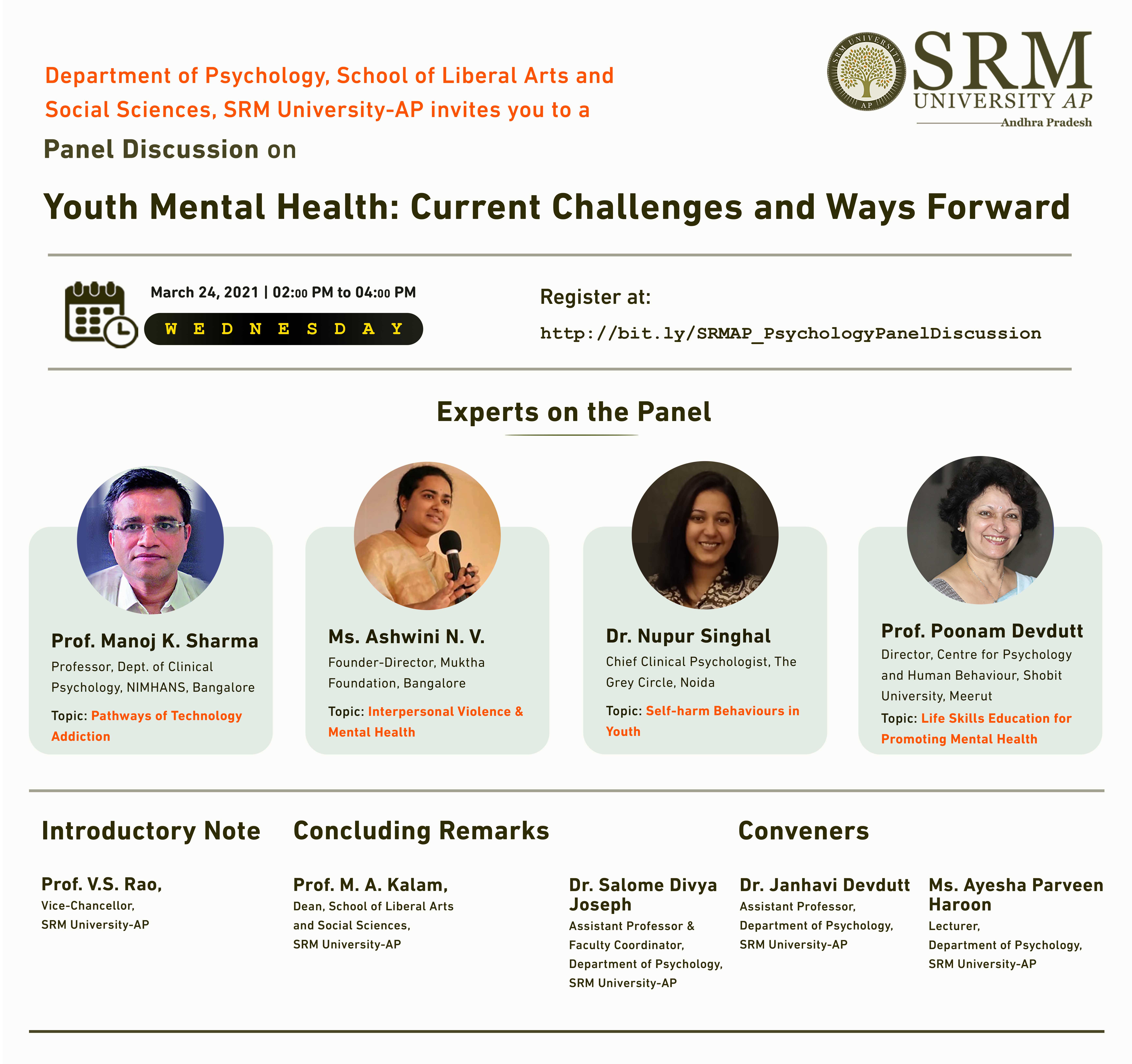 The Department of Psychology, SRM University-AP, Andhra Pradesh have organized a Panel Discussion on “Youth Mental Health: Current Challenges and Ways Forward”. Convened by Dr Salome Divya Joseph, Dr Janhavi Devdutt, and Ms Ayesha Parveen Haroon, the discussion will be held on March 24, 2021, at 2 PM. Prof V S Rao, Vice-Chancellor, will initiate the pertinent conversation and welcome the invited guests to the panel.