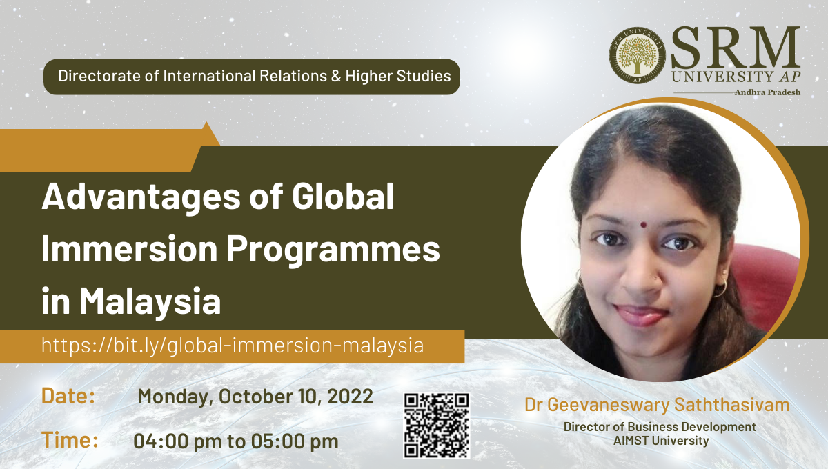 The Directorate of International Relations and Higher Studies is organising a webinar on the topic Advantages of Global Immersion Programmes in Malaysia to give students a brief overview of the Global Immersion Programmes in Malaysia and the benefits of undertaking them. Dr Geevaneswary Saththasivam, Director of Business Development, AIMST University, will be the keynote speaker for the event.