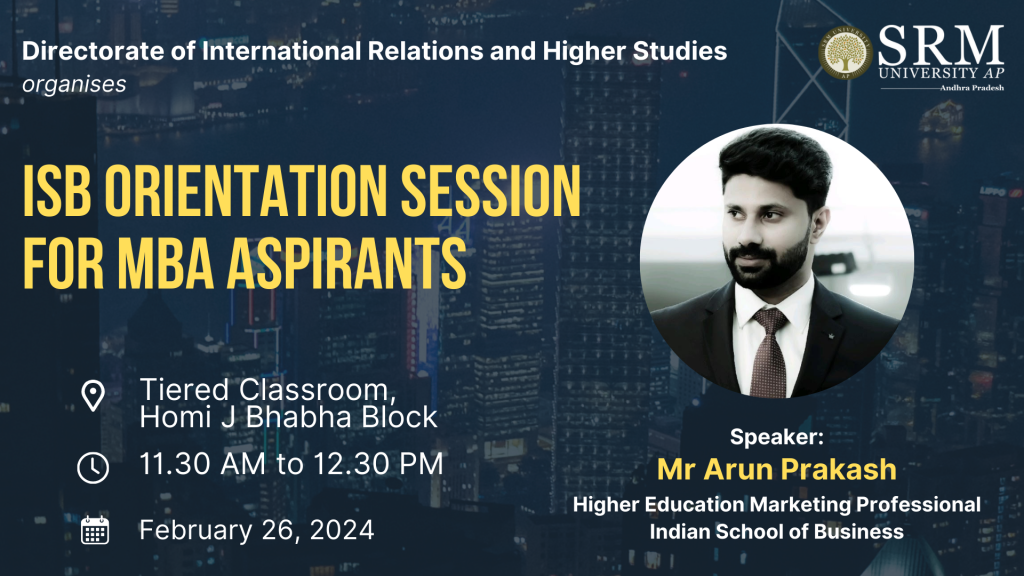 The Department of International Relations and Higher Studies (IR&HS) is organising a seminar on “ISB Orientation Session for MBA Aspirants” on February 26, 2024. The seminar is aimed at pre-final or final-year undergraduate and postgraduate students who want to equip themselves with multidisciplinary perspectives, thinking skills, and research tools before they begin their Post Graduate Programme (PGP) in Management.
