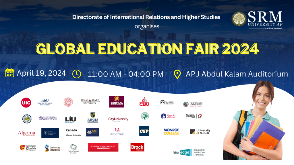 SRM University-AP offers students a wide range of opportunities to explore the world of global education. The Directorate of International Relations & Higher Studies is organising a “Global Education Fair” on April 19, 2024, for students to connect with representatives from US, UK, Canada, Australia and other universities around the world. The Fair is a golden opportunity to discover a wide range of programmes in various fields, get personalised advice on admissions, scholarships, and visas, and learn about exciting career opportunities after graduation.