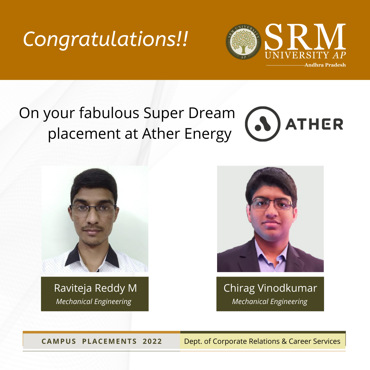 I’m very excited and happy in receiving the job offer from Ather Energy. From the beginning of my B Tech itself, I have had much interest and passion towards automobiles which actuated me to do many projects. This in turn helped me in gaining knowledge in Electric Vehicles and added extra weight to my resume. I extend my gratitude to SRM University-AP for supporting my projects by providing technical assistance and monetary help beyond measure. The Mechanical Engineering curriculum is diversified and helped me gain knowledge in fields like Manufacturing Technology, 3D printing, etc. Of course, my research in EV (Electric Vehicle) Tech has also helped me a lot.