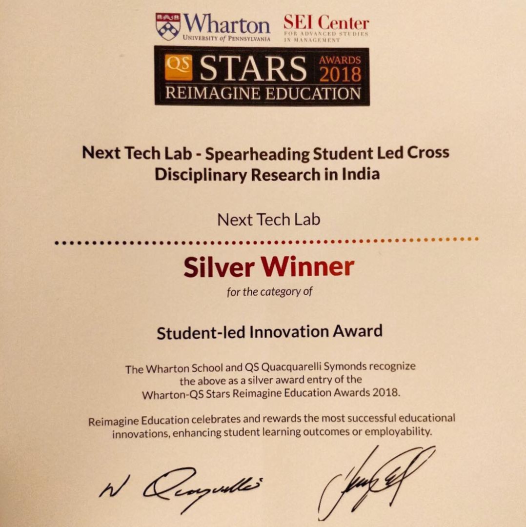 Next Tech Lab was awarded the Silver prize in student-led innovation for spearheading student-ledcross-disciplinary research in India. Nominees for the awards included Massachusetts Institute ofTechnology, National University of Singapore, Imperial College London and other renowneduniversities. The final nominees were selected from thousands of entries worldwide and invited totake part in the showcase pitch conducted at the conference.Next Tech Lab was founded by Anshuman Pandey and Aditthya Ramakrishnan who spent asemester at MIT, Cambridge on a scholarship. Intrigued by the anti-disciplinary research culture of the MIT Media Lab, they decided to start a lab at their own university. While Next Tech doesn’t just ape the Media Lab framework like in Richard Feynman’s anecdotes about “Cargo-Cult Science”, itspolicies are built to foster innovation and disruptive thinking. Researchers work on Deep Learning