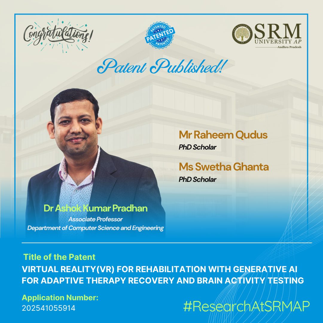 The Department of Computer Science and Engineering at SRM University-AP has yet again produced a scientific breakthrough. Associate Professor Dr Ashok Kumar Pradhan, along with his research scholars Mr Raheem Qudus and Ms Swetha Ghanta, published a patent on post-stroke rehabilitation using Virtual Reality and Artificial Intelligence.