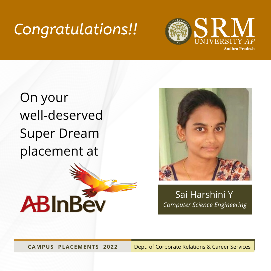 Yadlapalli Sai Harshini, a student from the Department of Computer Science & Engineering has received a mesmerizing job offer from the world’s largest brewing company, AB InBev, in the Engineering Campus Placement for the class of 2022. She will soon start working at the Global Capability Centre located in Bangalore with a CTC of 12LPA.