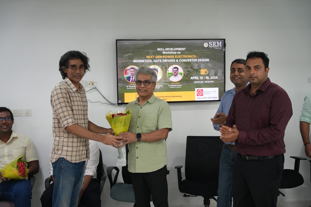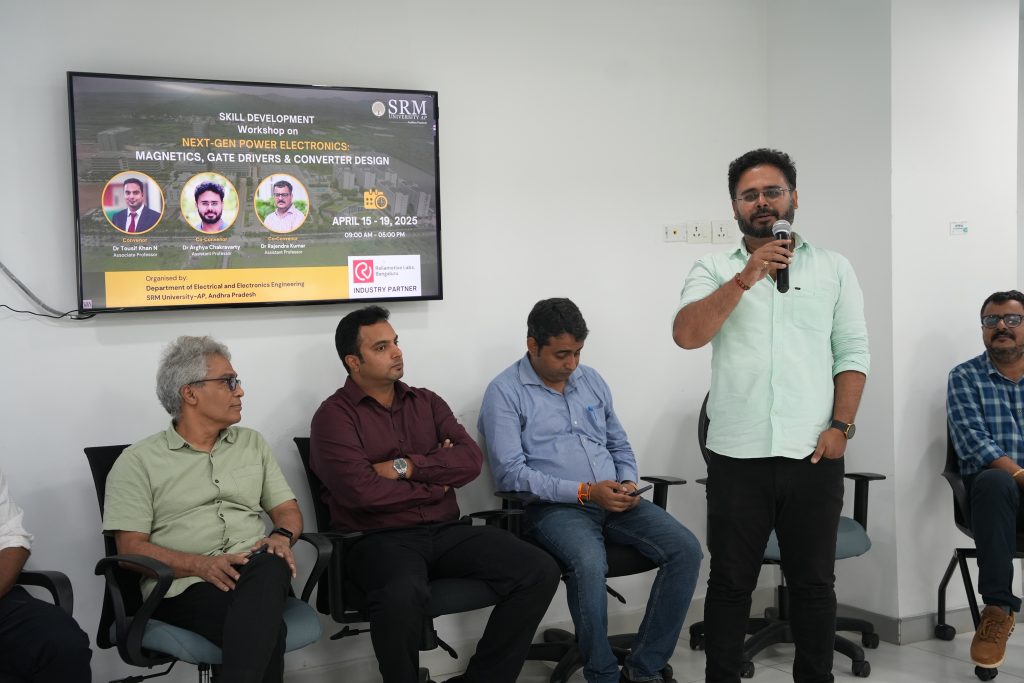 The Department of Electrical and Electronics Engineering organised a Skill Development Workshop on Next-Gen Power Electronics: Magnetics, Gate Drivers & Converter Design. Mr Sadeep Sasidharan, Director, Reliamotive Labs, Dr Ashiq Muhammed, Assistant Professor, NIT Calicut and Mr Aravind Gopalakrishnan, Co-founder, Reliamotive Labs, were the resource persons for the workshop along with faculty members of SRM University-AP.