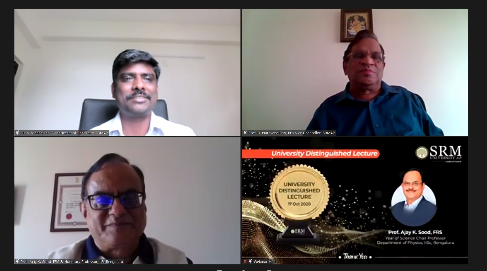 The first University Distinguished Lecture on “Doing Science Without Borders” commenced with an inaugural welcome speech by Prof V S Rao, Vice-Chancellor, and Prof D Narayana Rao, Pro-Vice-Chancellor, SRM University-AP, Andhra Pradesh. Prof V S Rao expressed their gratitude to Prof Ajay K Sood for his gracious presence. Prof Narayana Rao emphasized that under the University Distinguished Lecture series, the talks will be delivered by eminent scientists from India and abroad that would be of immense benefit for students and the faculty and researchers. He further mentioned, “Doctors, researchers, engineers and scientists from several fields of knowledge around the world worked together to confront corona outbreak with an unprecedented spirit of collaboration. Also, NEP advocates and emphasizes that the societal need of the 21st century require broad-based multidisciplinary research and education”.