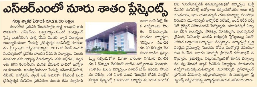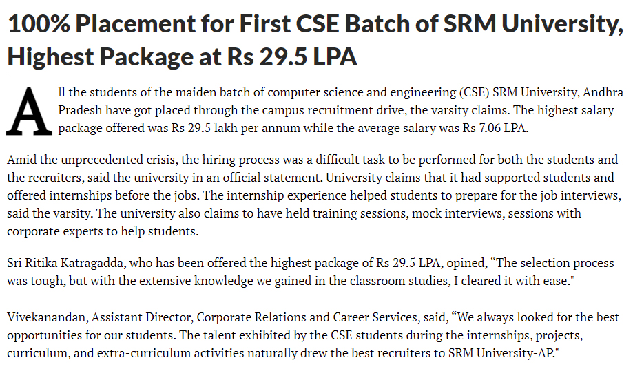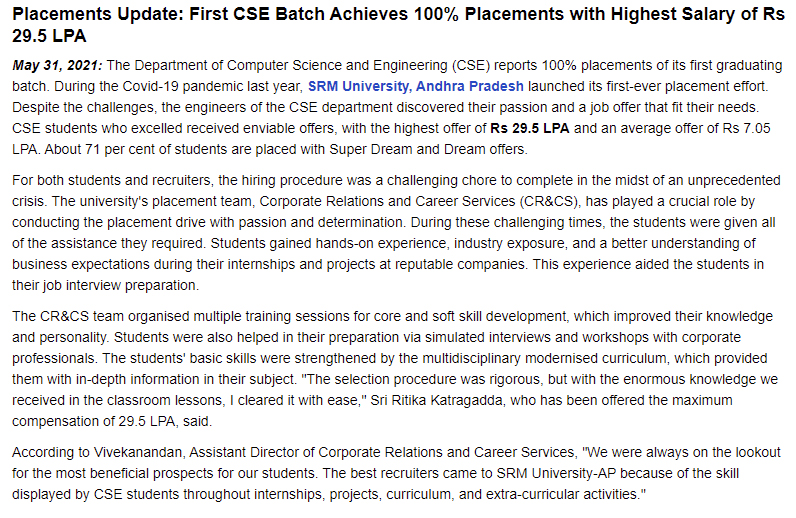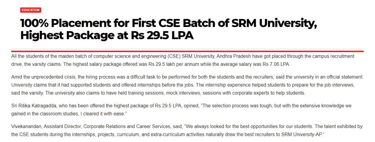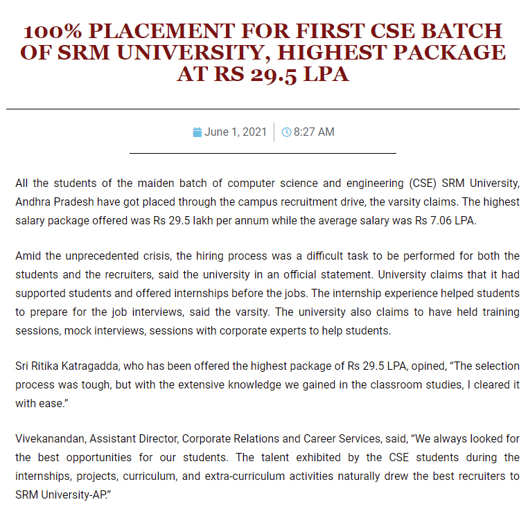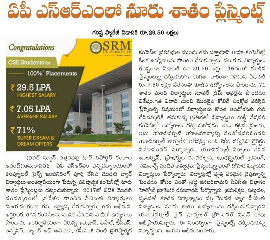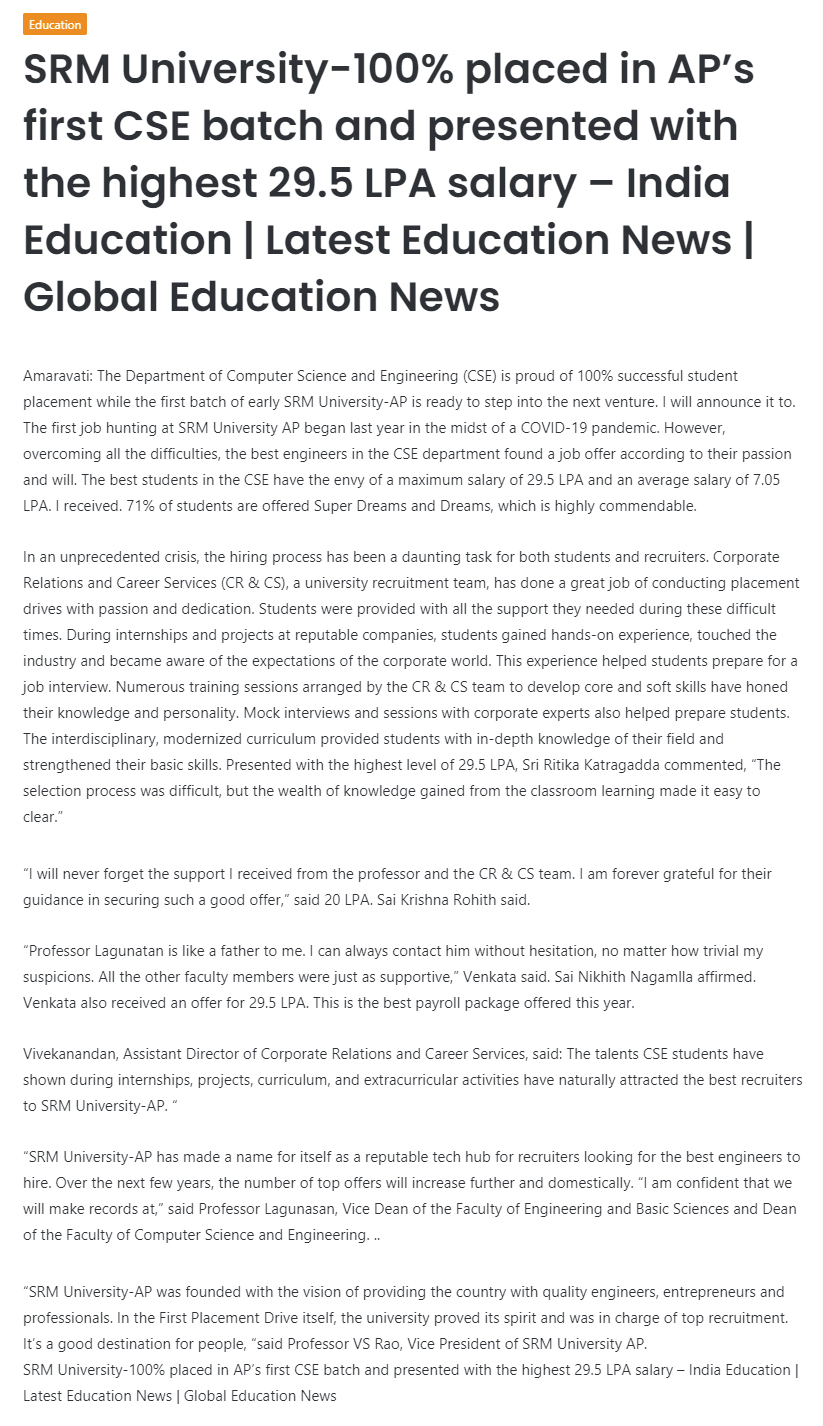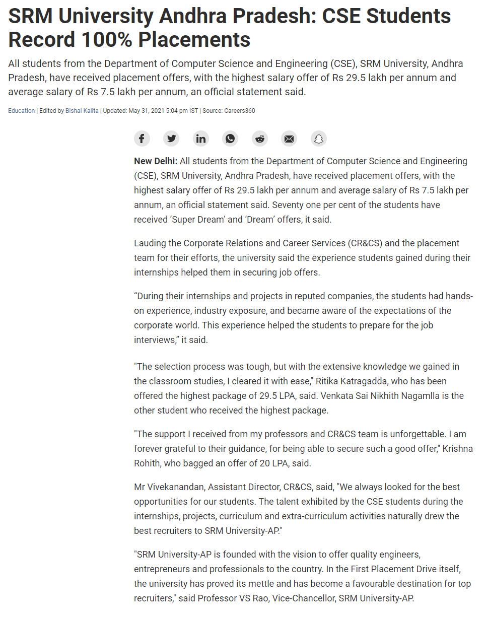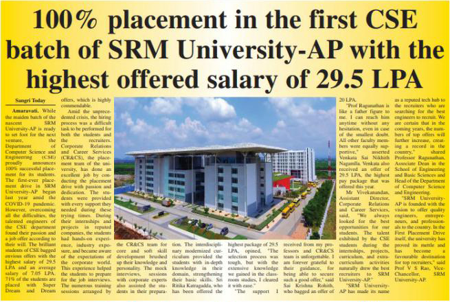 100% placement in the first CSE batch of SRM University-AP with the highest offered salary of 29.5 LPA