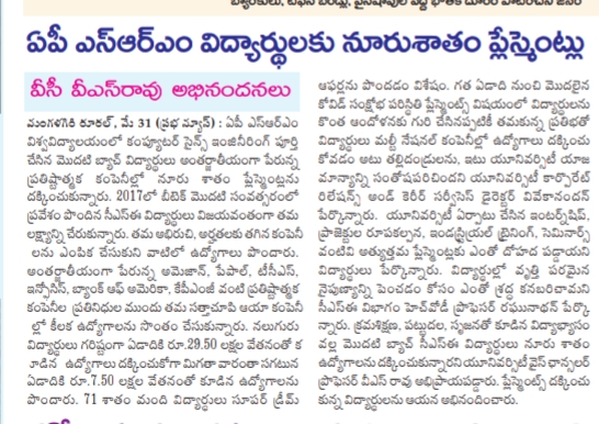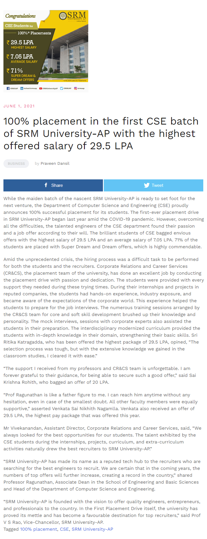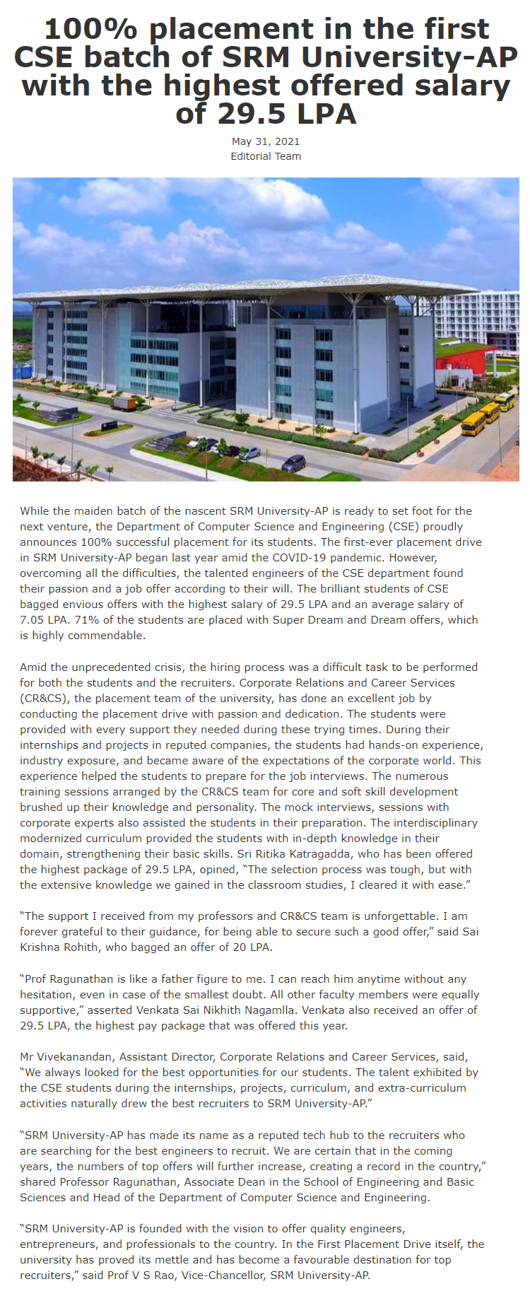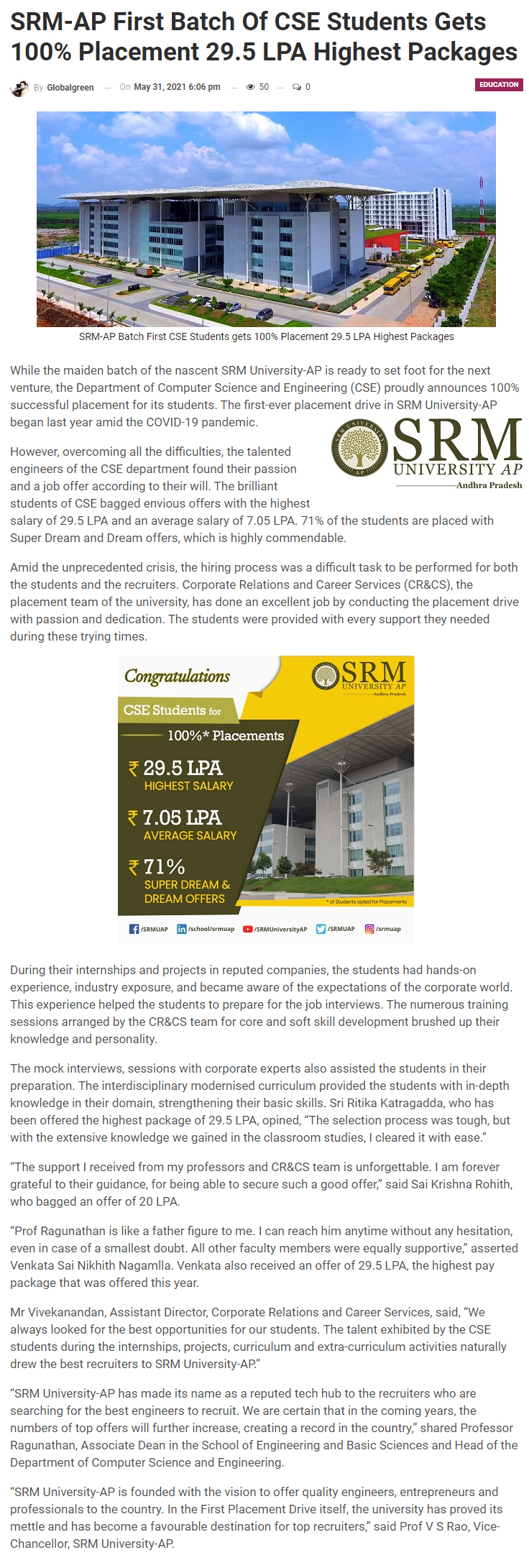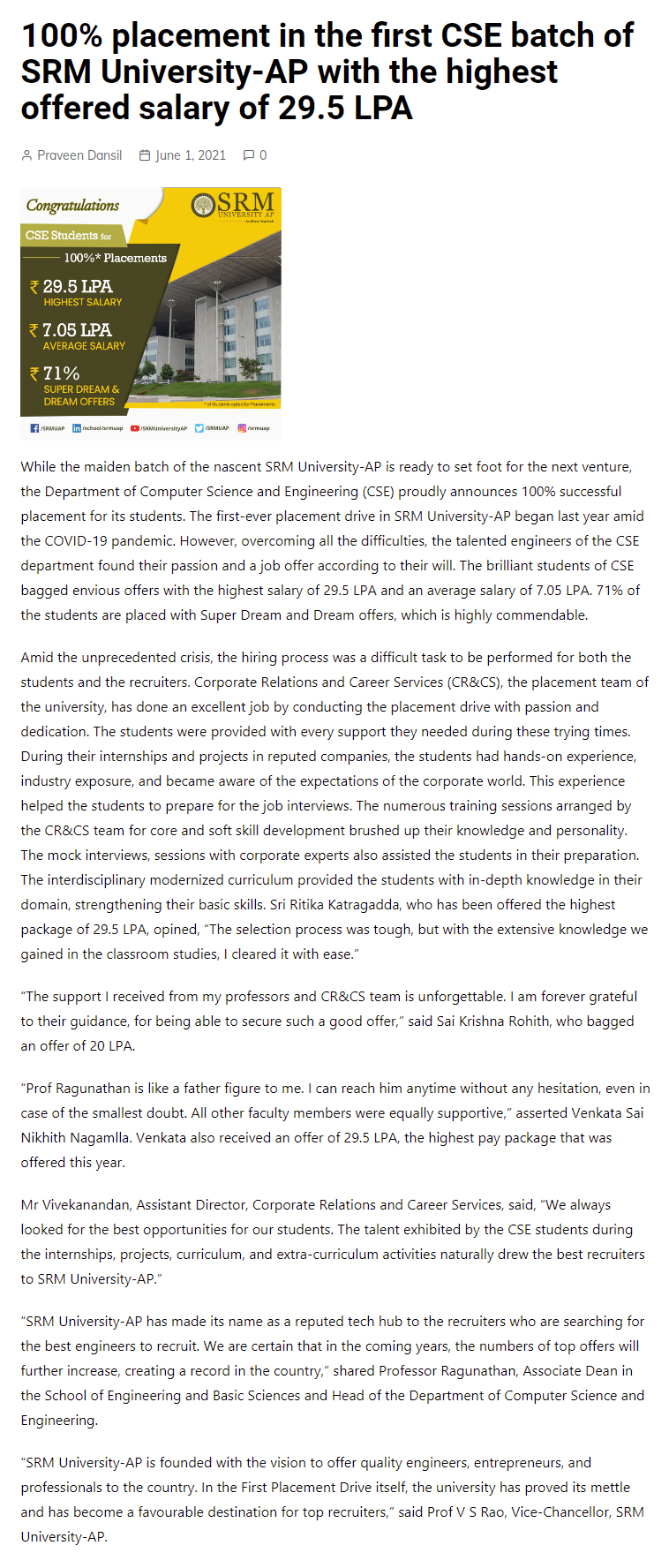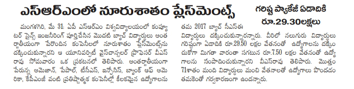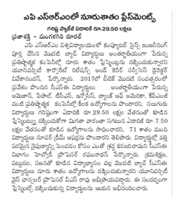 100% placement in the first CSE batch of SRM University-AP with the highest offered salary of 29.5 LPA