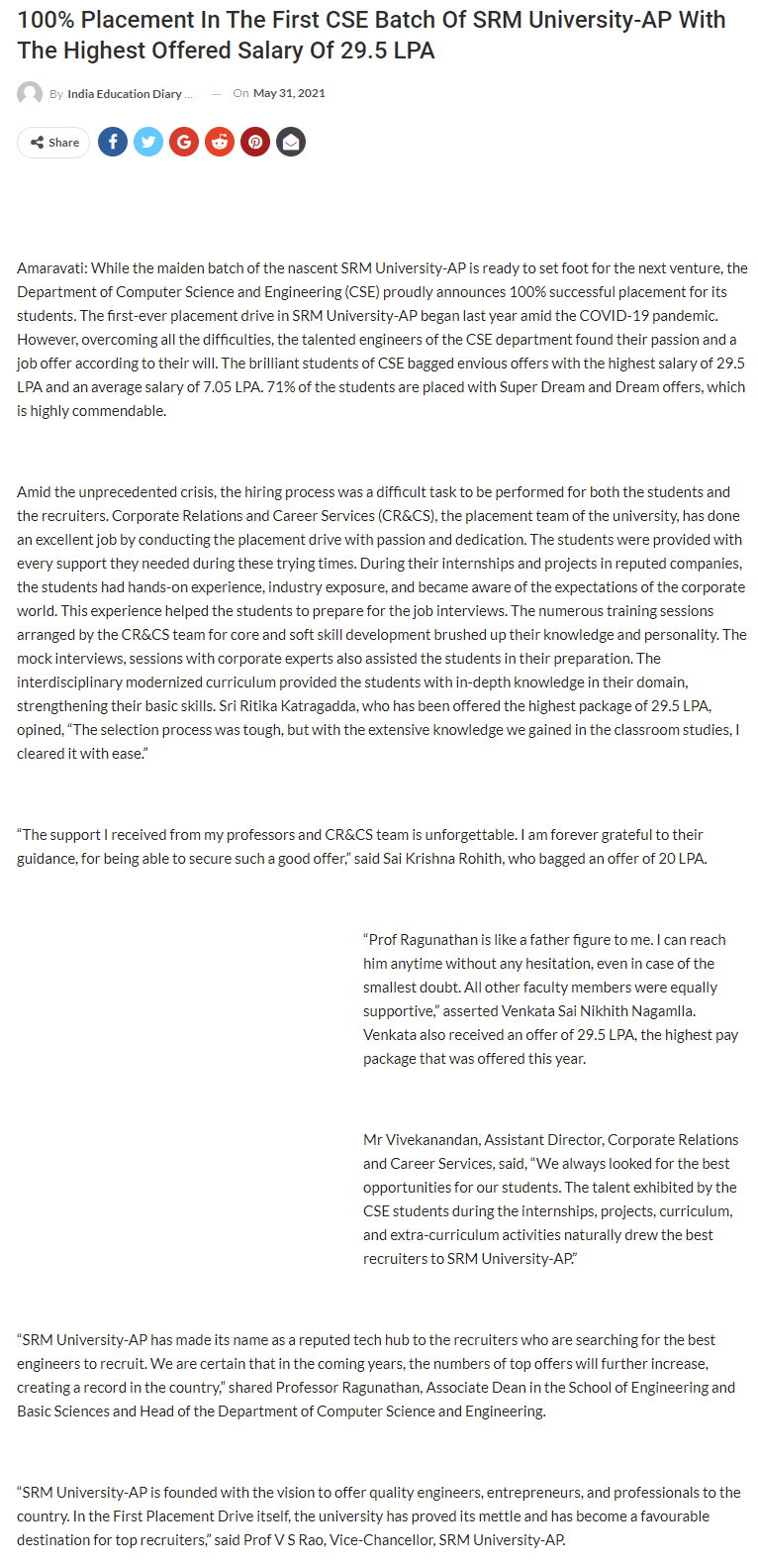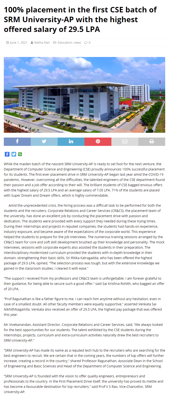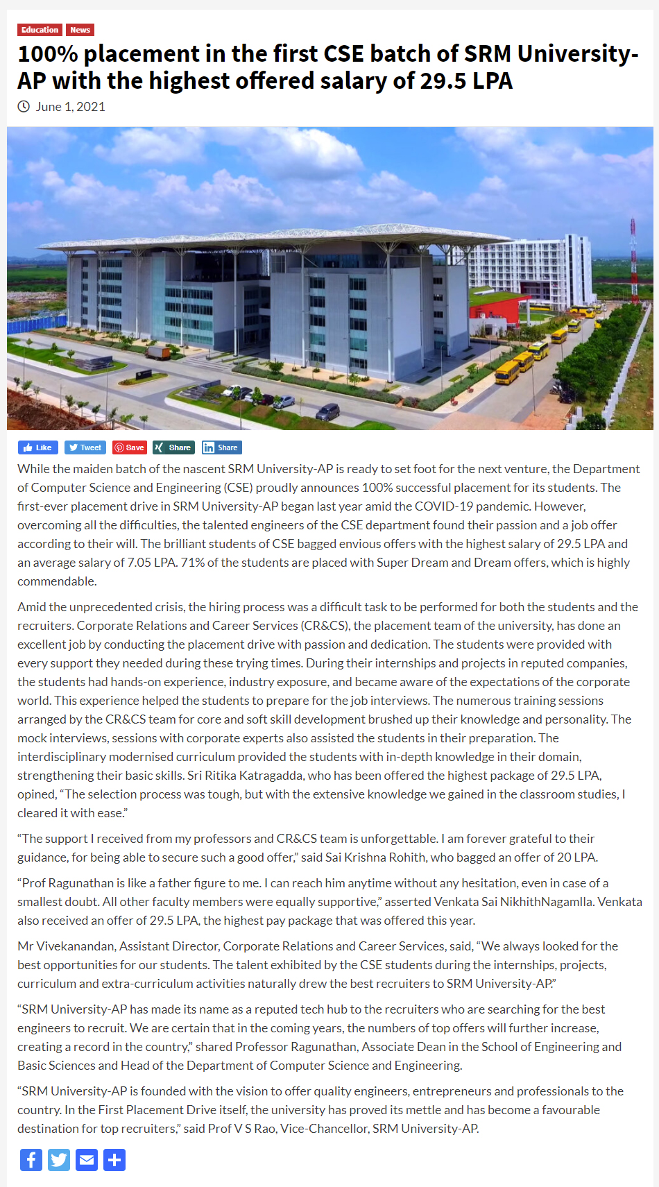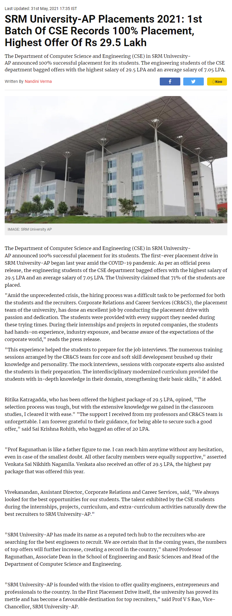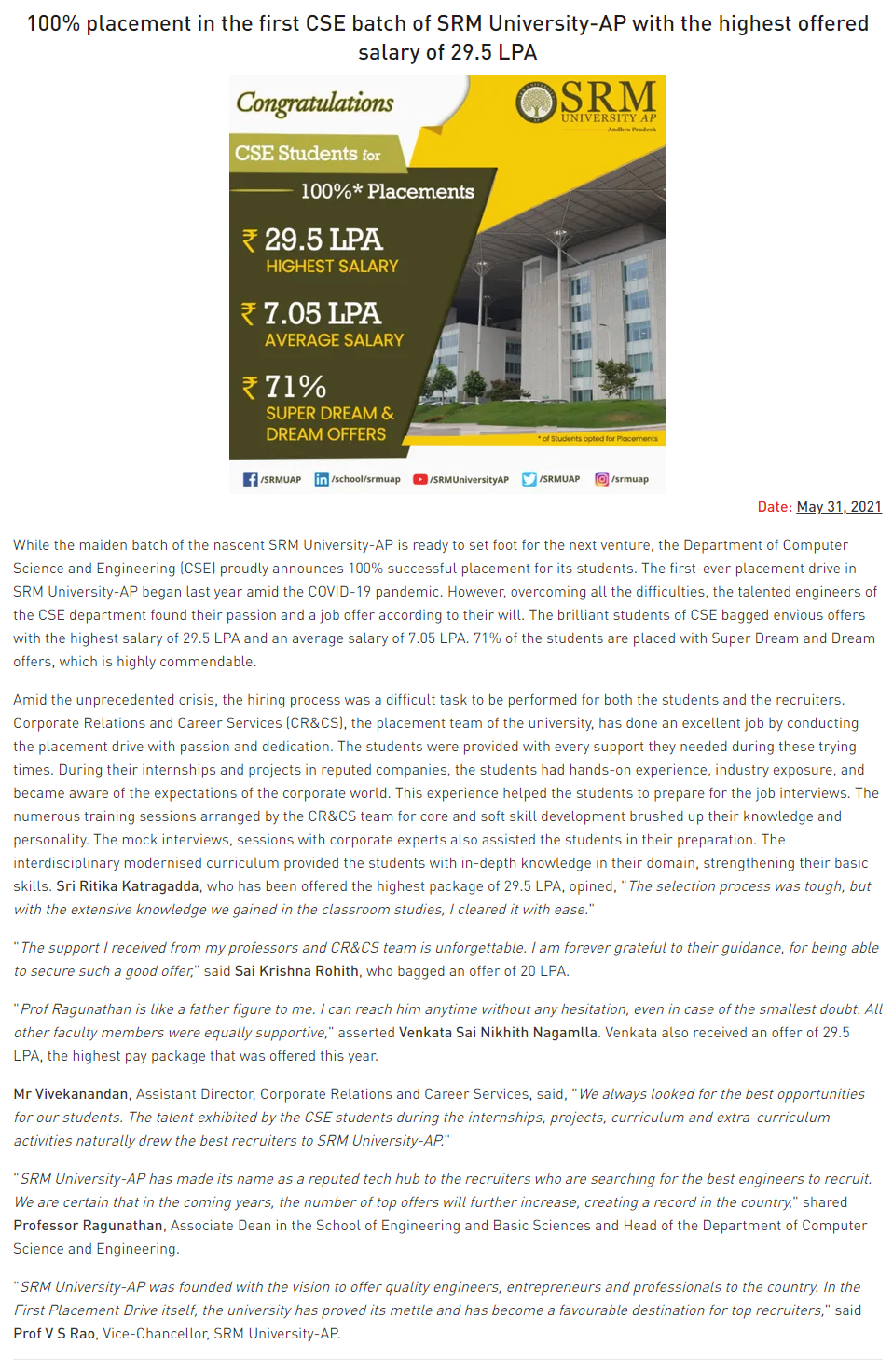 100% placement in the first CSE batch of SRM University-AP with the highest offered salary of 29.5 LPA