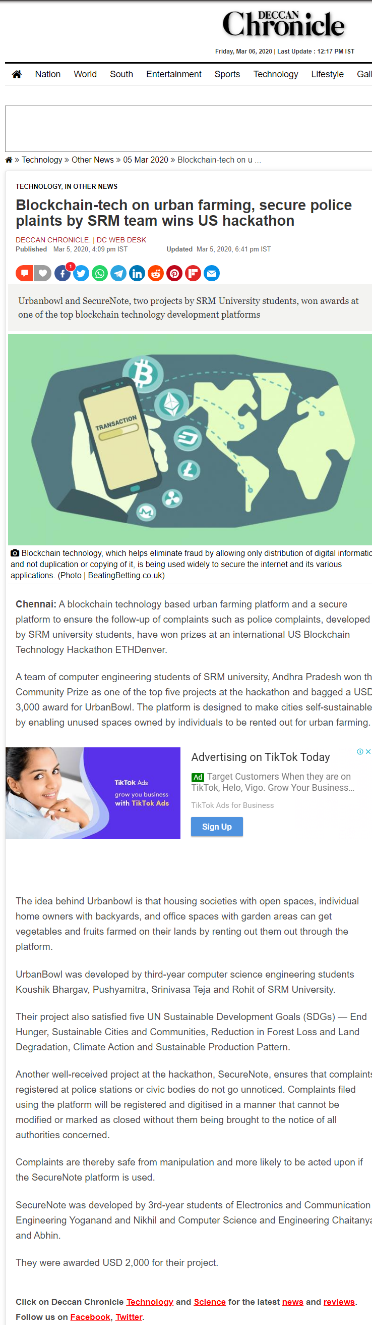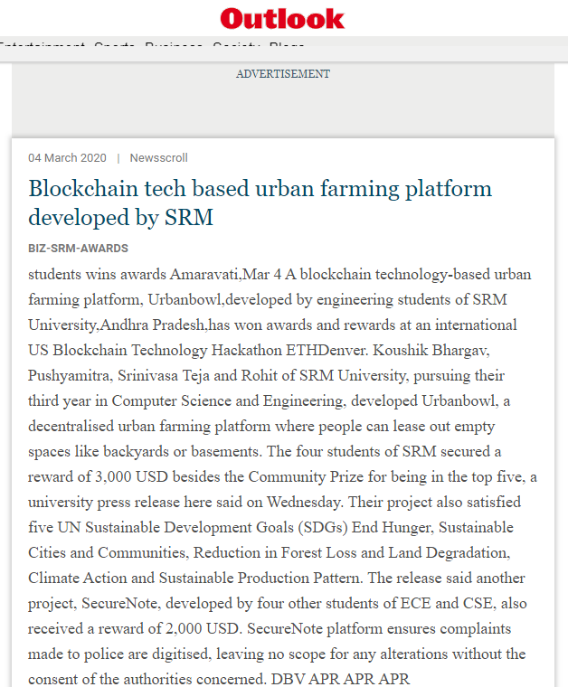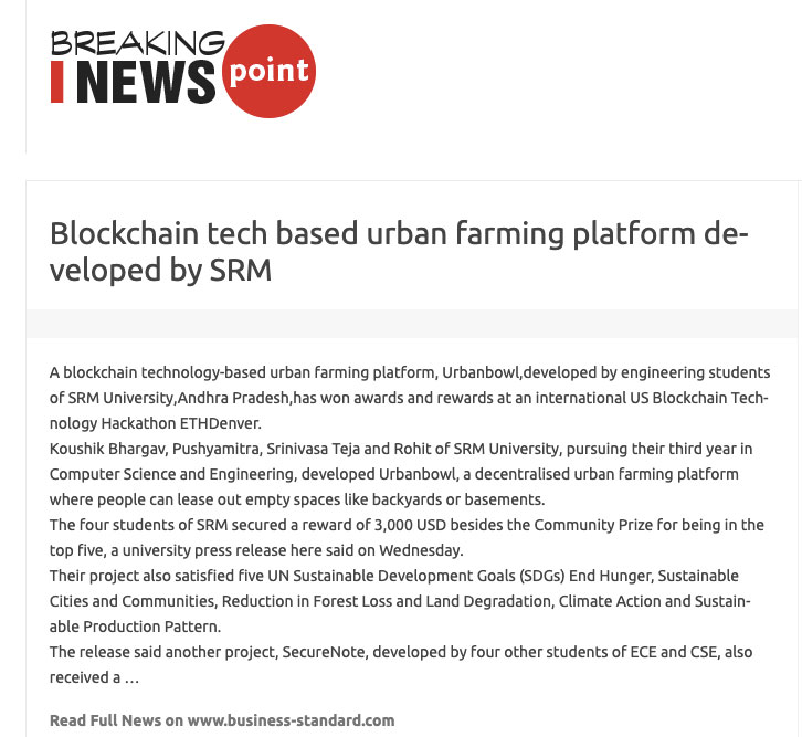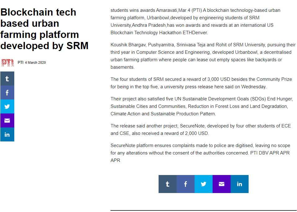 Blockchain tech based urban farming platform developed by srm